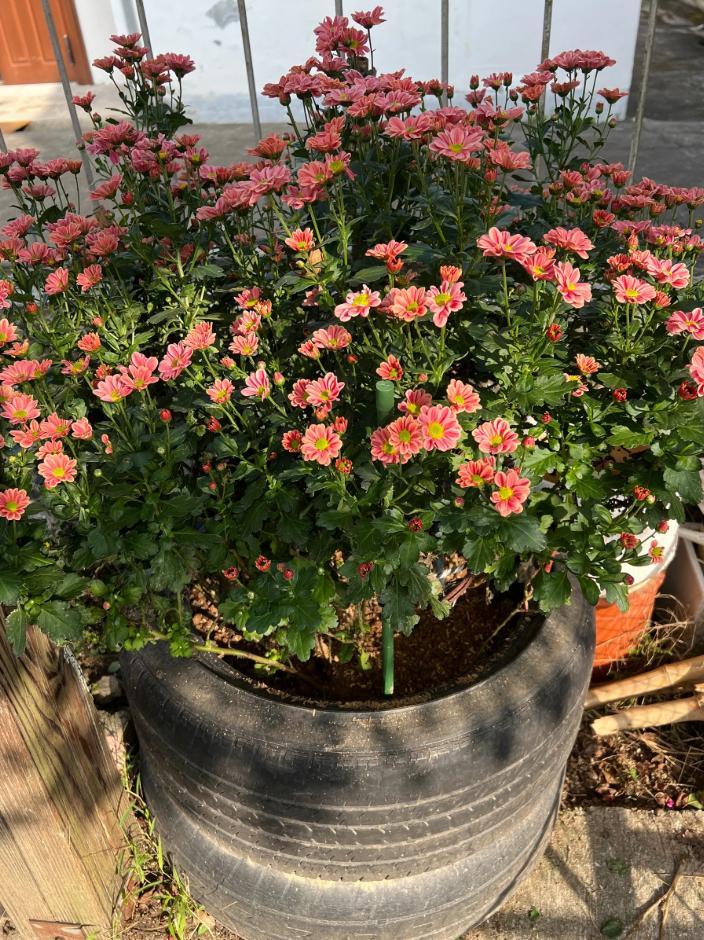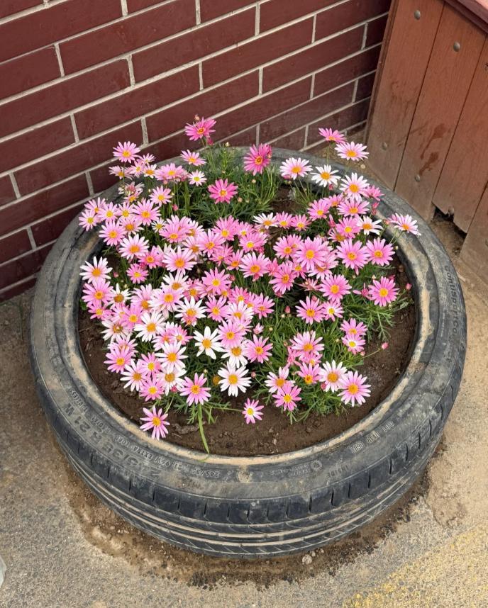 (輪胎直徑大,比花盆好用多了,而且不管是養小雛菊,還是太陽花,養多了就變成小花海~)
