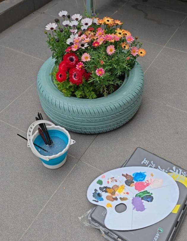 撿了倆舊輪胎,感覺拿來種花挺合適的,操練起來,剩下的半罐子戶外油漆正好利用起來,再畫上喜歡的圖案,小花壇修煉成功!