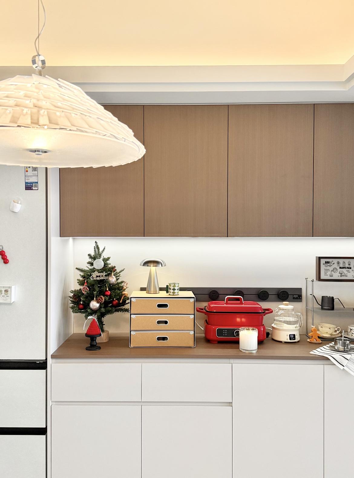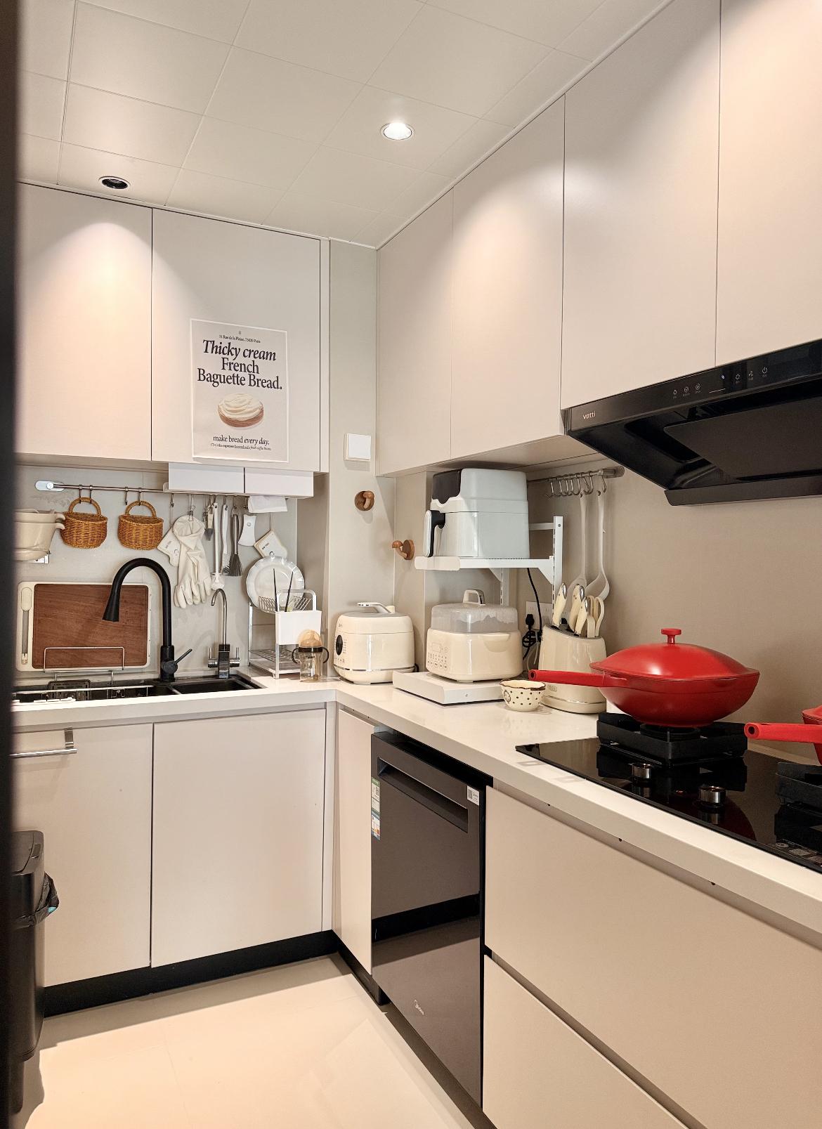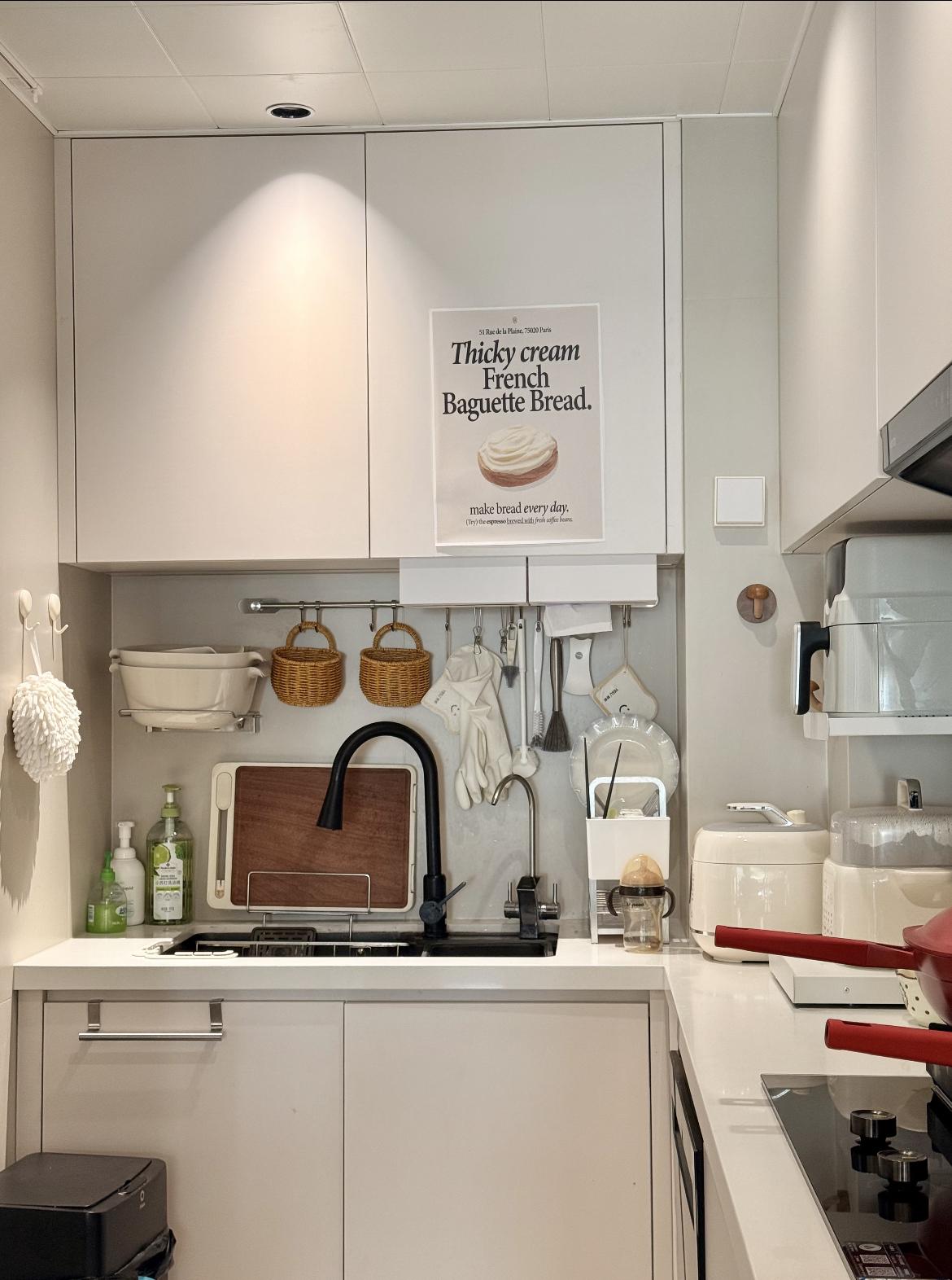 配色顯通透:全淺白櫃+同色檯面,視覺“撐大”空間不壓抑;細節藏溫柔:紅色鍋具當點綴,連收納筐都選藤編款,煙火氣裹着清新感!