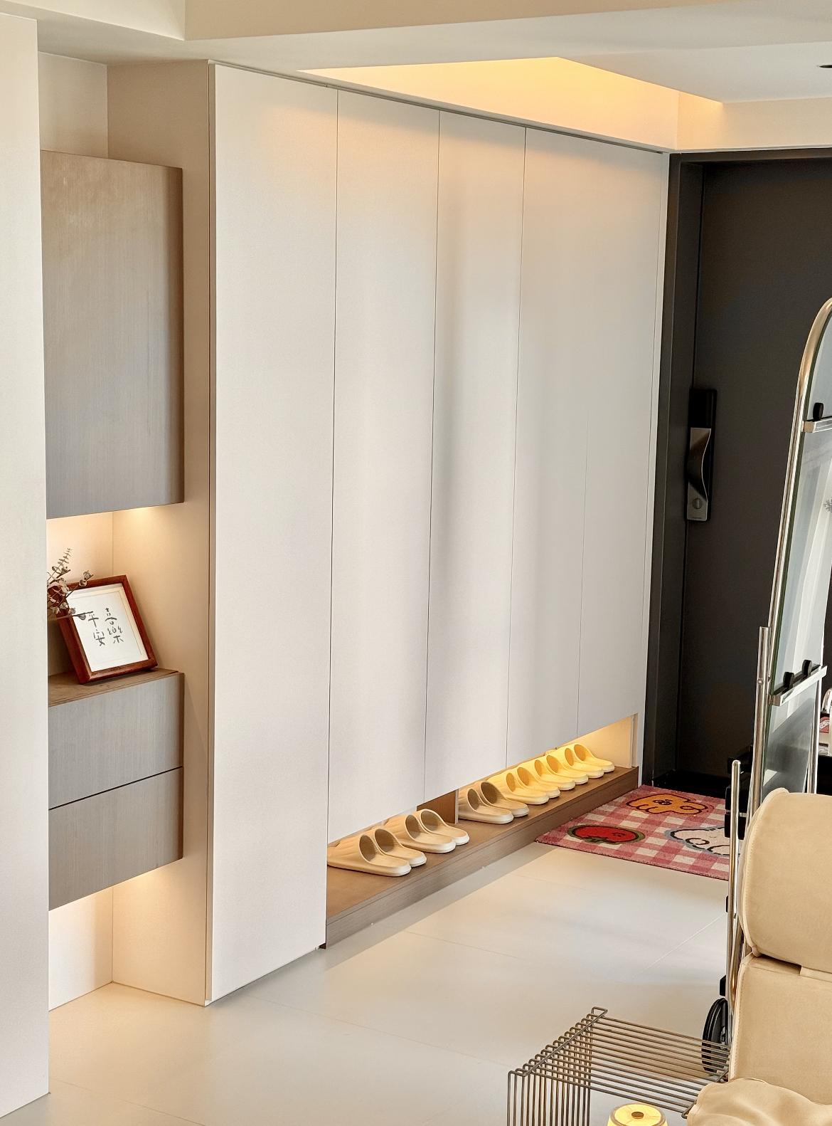 一進門的右手邊做了滿牆鞋櫃,用於收納一家人的鞋子和日常用品,櫃體底部做了架高設計主要是爲了避免掃地機器人亂撞,其次留空了15公分用於放置一家人的拖鞋,出入門換鞋也比較方便。