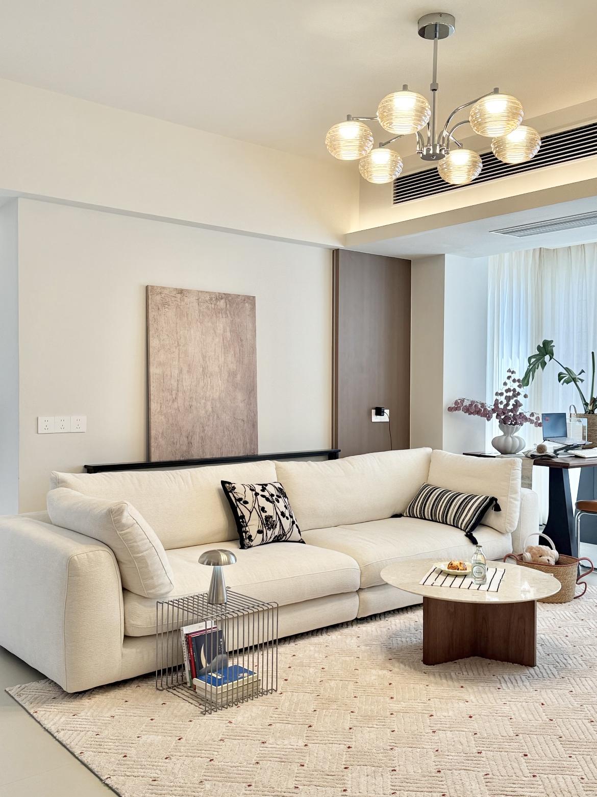 俗話說的好“輕硬裝,重軟裝”,家的溫度,大部分都是靠軟裝搭配出來的,一盞溫柔好看的燈,一張有質感且舒適的沙發,再加上一張舒適的地毯,保持色調統一的情況下,溫馨家的感覺一下子就有了。
