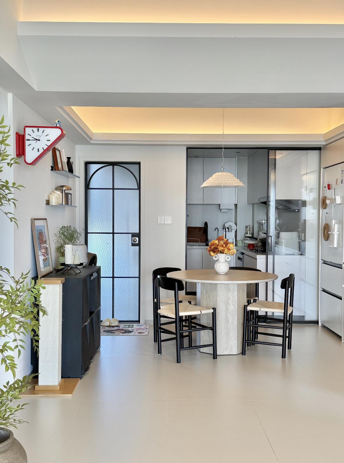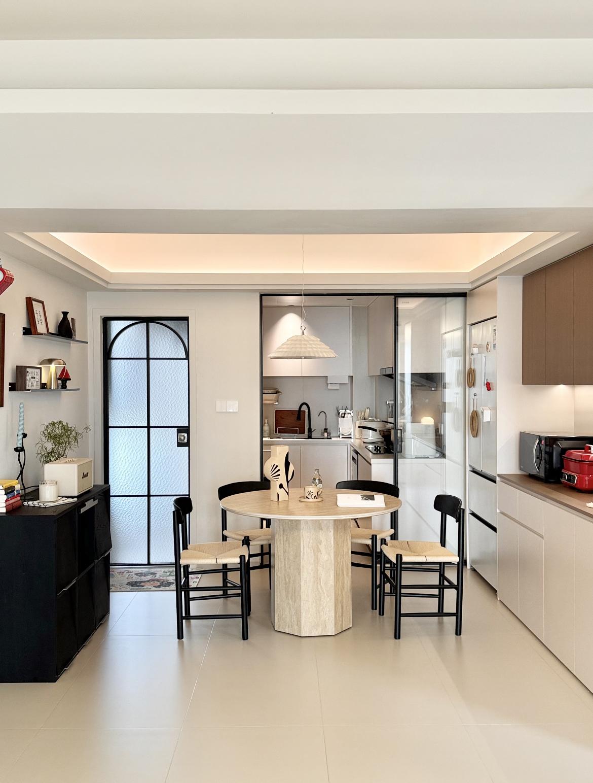 傢俱選得巧:圓餐桌+細框椅,視覺“縮”出3㎡空感;拱門玻璃門柔化邊界,廚房藏得高級又通透;