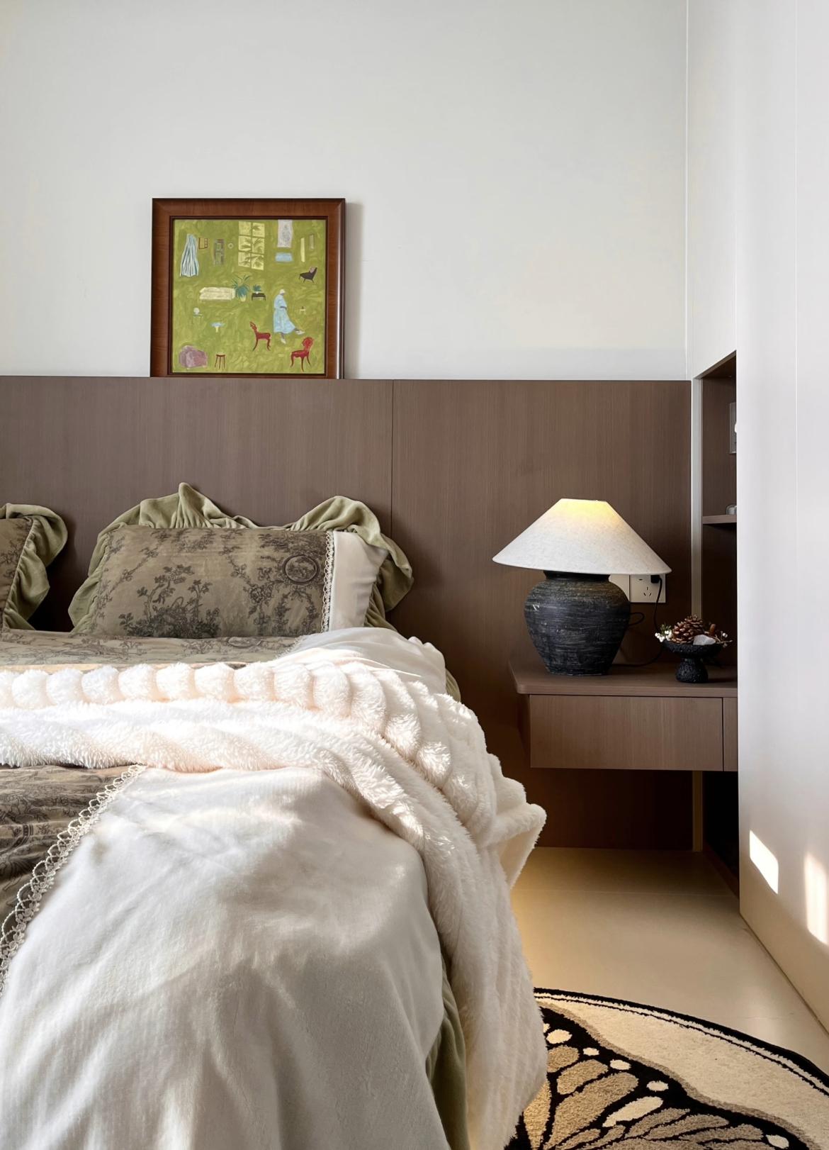 拒絕過度裝飾的臥室,主打一個簡單好看且耐看的臥室。白牆+木質護牆板構成乾淨畫布,懸浮式牀體巧妙騰出呼吸感,再搭配幾件精心挑選的單品作爲點綴,整個空間瞬間就有了溫度。