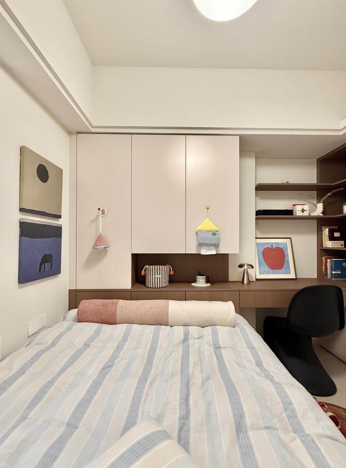一體櫃省空間:榻榻米連書桌+頂櫃,睡覺、寫作業、藏雜物全在這區搞定;配色顯柔和:淺米+深棕撞色,暖調裹着童趣,連裝飾畫都戳中娃的審美;細節藏巧思:櫃門掛小物、開放格擺裝飾,連紙巾都能藏成可愛小房子!