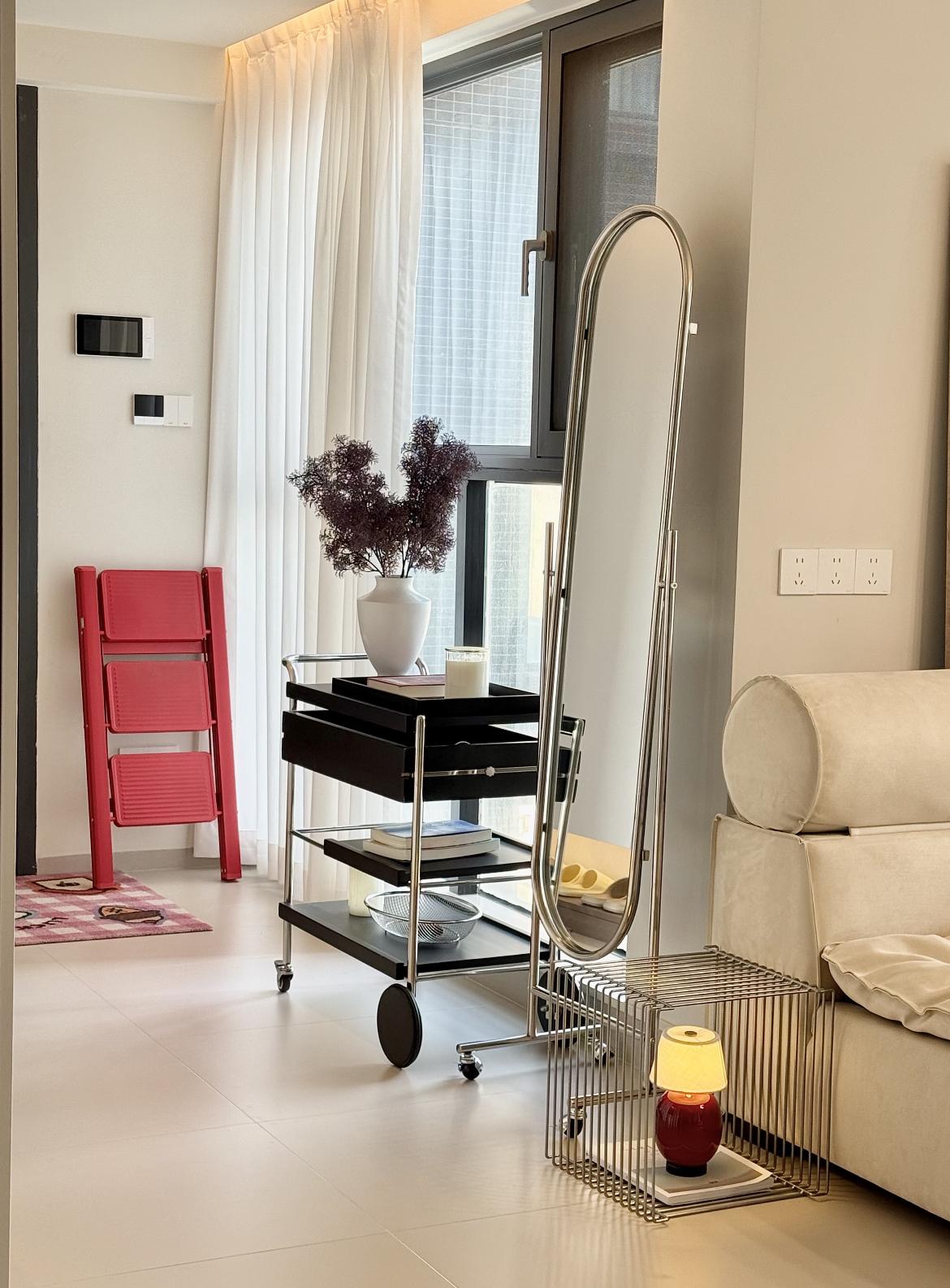 入戶玄關的左手邊通過巧妙的設計,使這個區域的採光變得更加敞亮,原本在全身鏡位置是有一堵牆,砸了過後視覺上也變得非常通透。
