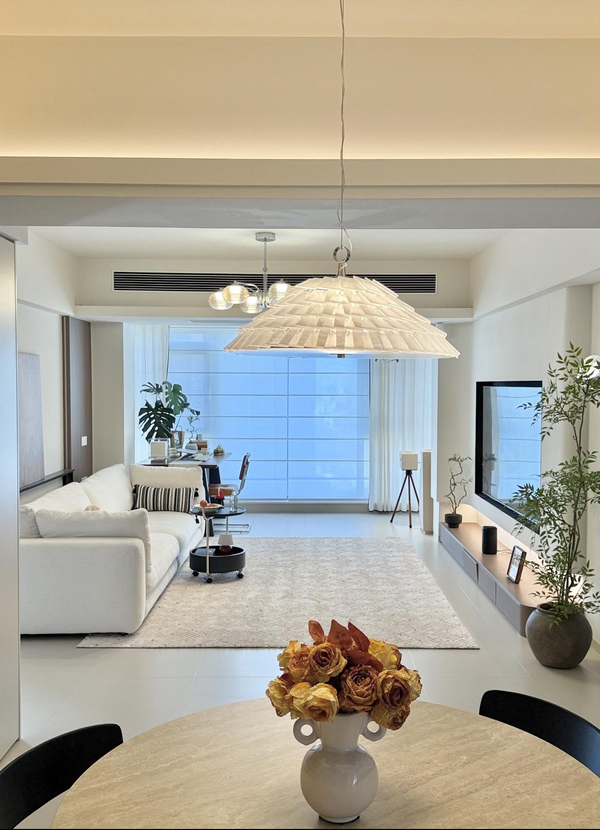業主很清楚複雜的吊頂不僅會壓低層高還會顯得壓抑,明智的選擇了只做了一圈雙眼皮吊頂,再搭配輕盈的吊燈,在不壓低層高的同時,空間感也得到了提升。