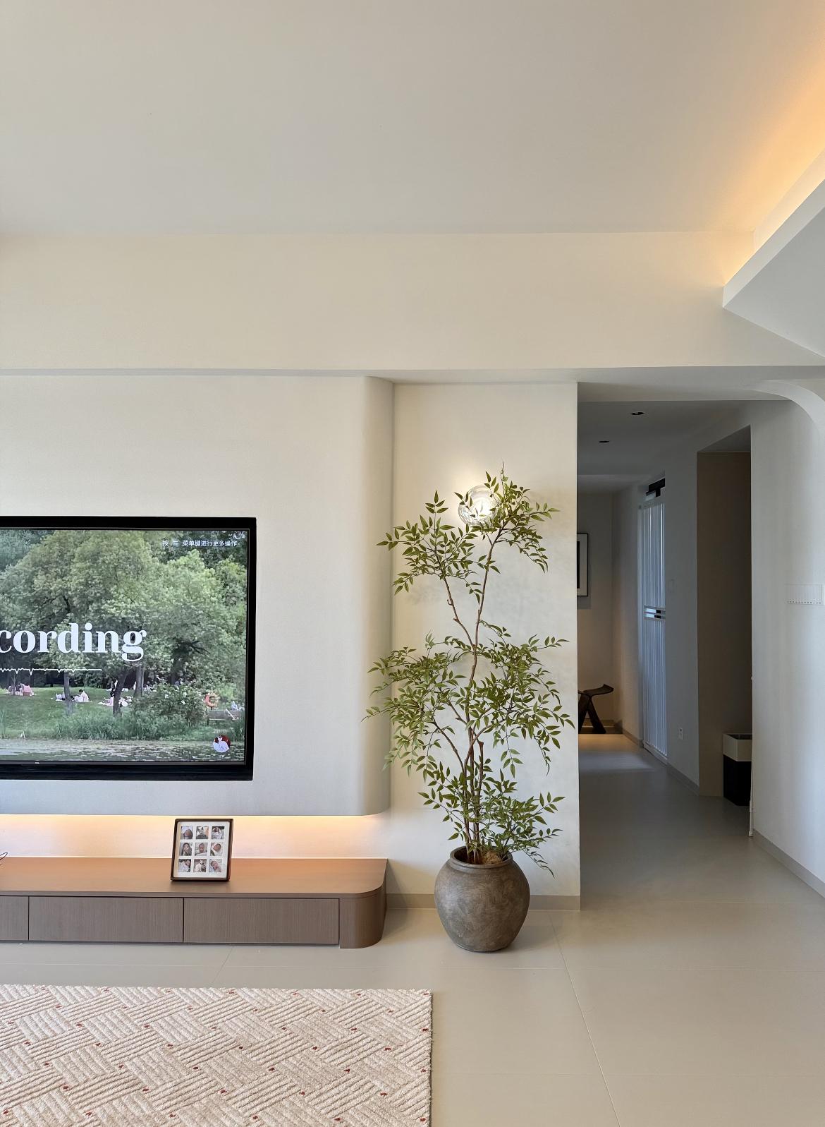 落地電視櫃不留衛生死角,其次電視櫃邊緣採用柔和的倒圓角設計,與電視背景牆自然銜接,視覺上更顯得協調溫柔;電視牆底部做了燈帶,使其更具氛圍感。