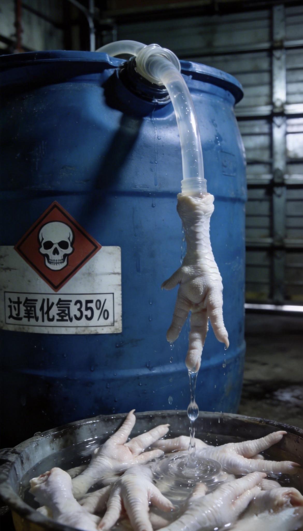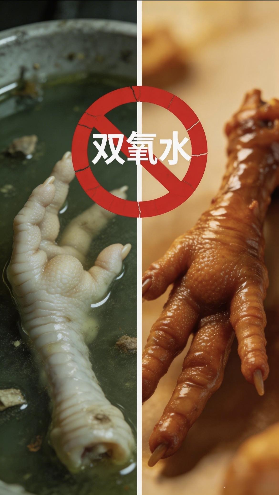 成都蜀福香、明揚食品、重慶曾巧食品等企業,爲讓雞爪賣相白淨,違規使用國家明令禁止的工業級雙氧水浸泡加工,車間污水橫流、雞爪直接堆放在地面被踩踏,工人無健康證上崗,甚至直言“自己從來不喫”。