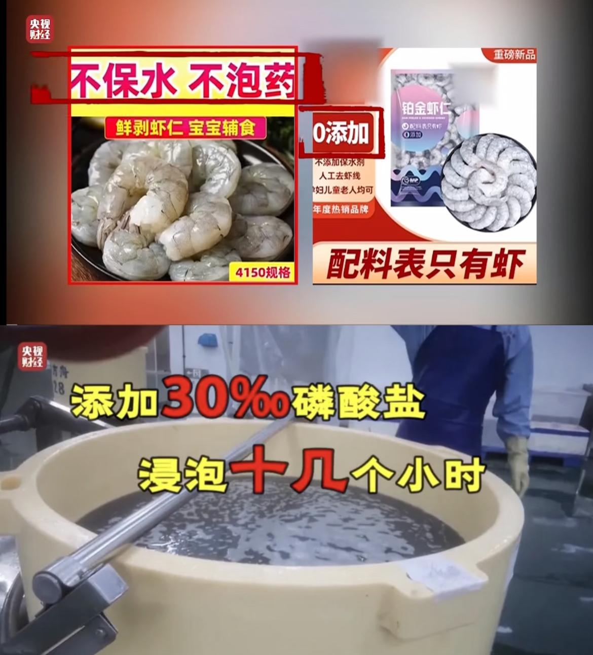 水產市場的“泡藥增重蝦仁”同樣被嚴厲打擊。湛江、連雲港等地尚方舟、中青海洋等7家水產企業,超量添加複合磷酸鹽,最高超標145%,100斤蝦仁經浸泡、包冰後能增重至124斤,包冰率超70%,解凍後嚴重縮水,卻不標註添加劑信息。