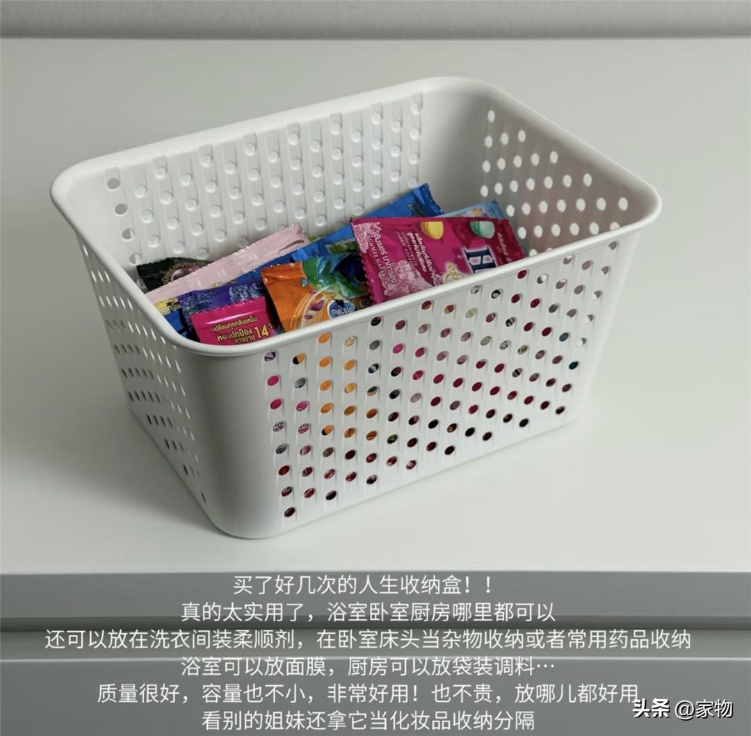 這小籃子本身帶網眼,透氣性非常不錯,雖說原本是設計在浴室放些清潔洗漱用品的,但兩年用下來發現,其實它能做的事兒還真不少,比如在廚房收納調味料,又比如放在客廳裏當零食籃,用起來都順手。