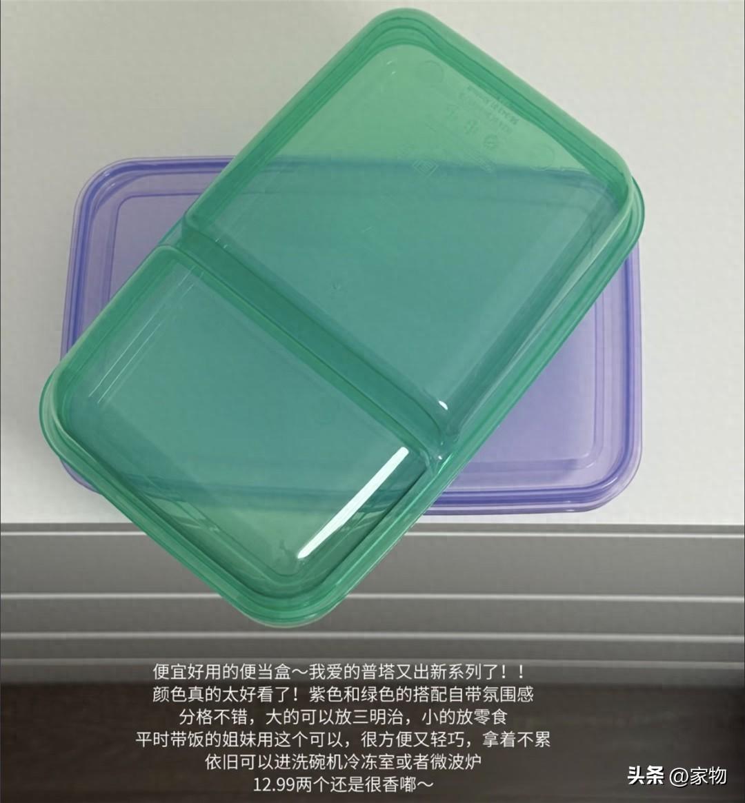 這小盒子之前一直用那個綠色的,後來出了藍色蓋子的也買了回來,大小和普通飯盒也差不多,但其實密封性不算強,如果能保證飯盒不會傾倒,用它帶飯倒是方便,但其餘情況下,還是建議放些水果、零食、三明治這類不怕灑的食材,輕便好用。