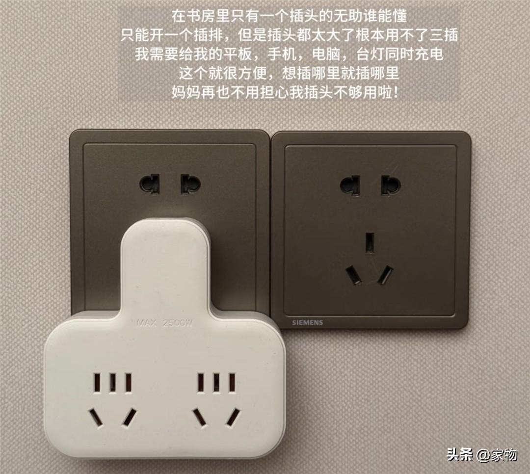 裝修時插座預留不夠的房間,與其用大插排,還真不如直接在插座上插一個這種一拖二的迷你插,可以瞬間將一個5孔插座擴展爲2孔+雙5孔,間距剛好合適,既能插得下,又不用擔心它太佔地。