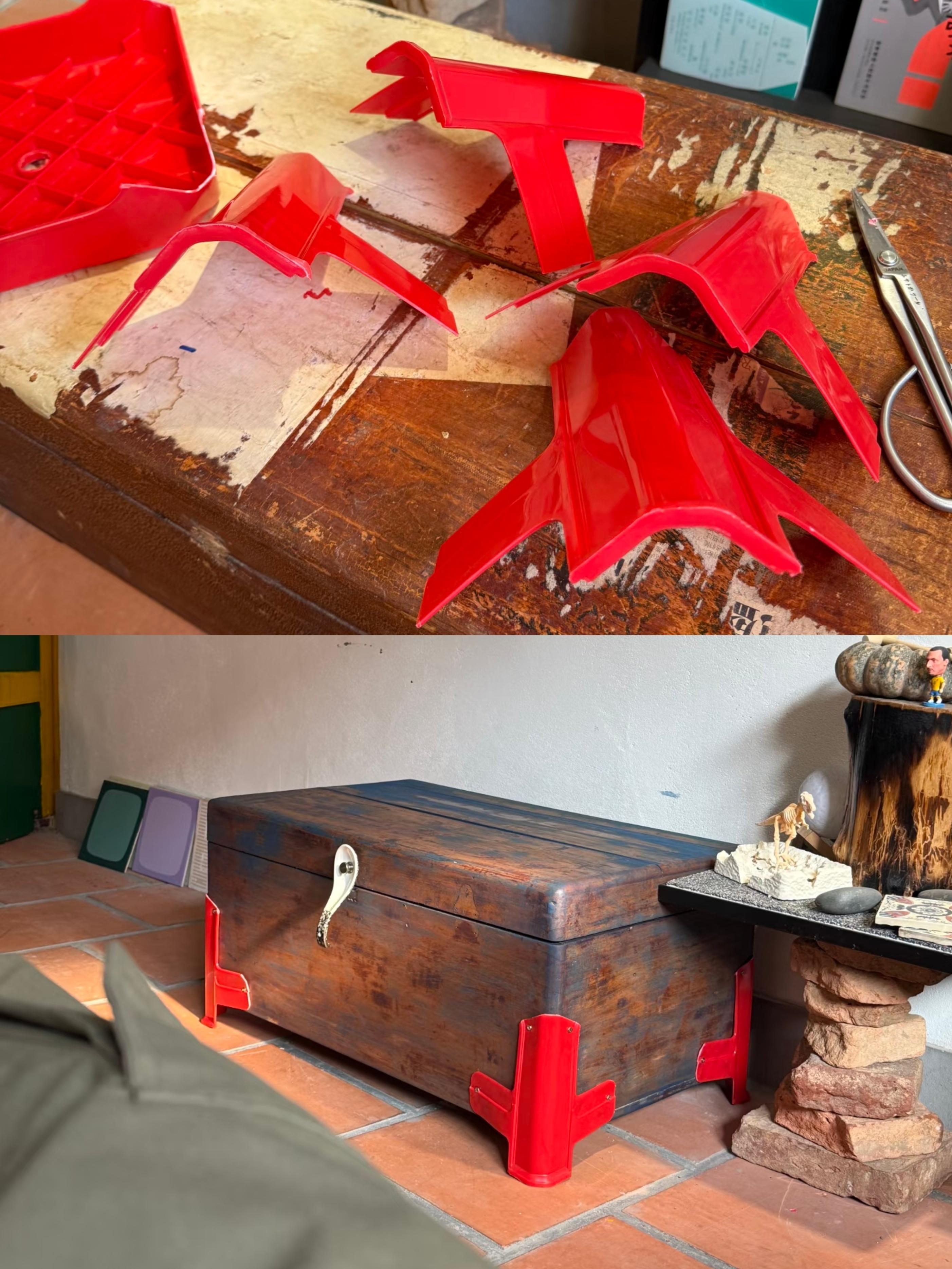 更着實沒想到的是,省凳腿還能受到這種器重,墊在木箱子四個角上,還防水,絕了。