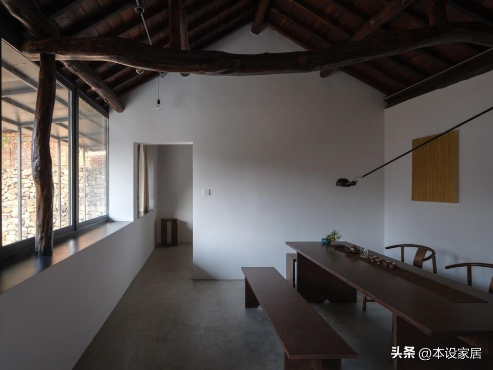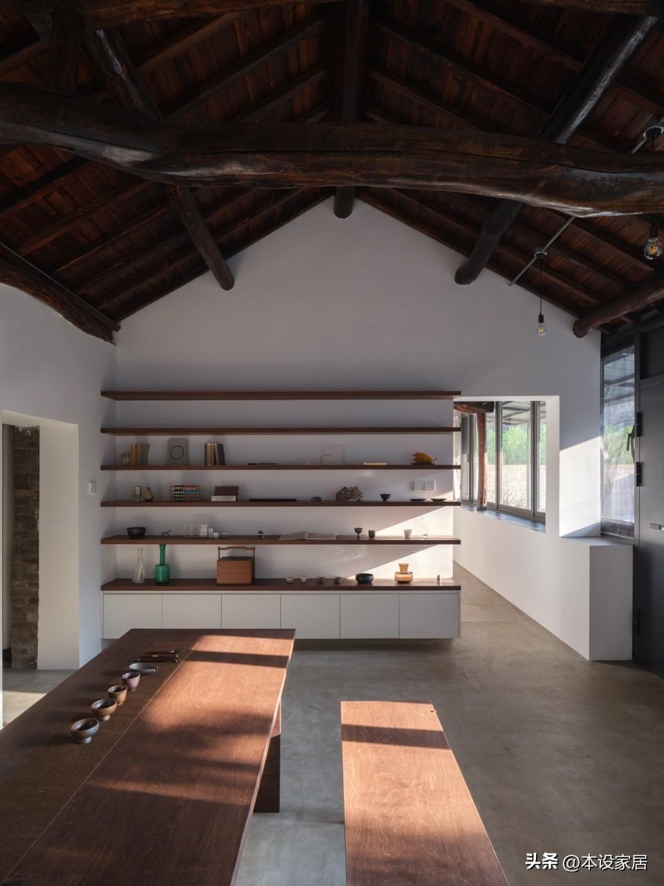 起居室的設計可以說“新舊共生”,地面做水泥自流平,牆面刷白色乳膠漆,與原有的深色原木樑柱形成強烈的對比,搭配造型簡約的實木長桌與長凳,賦予空間歷史溫度的同時,也營造出沉靜質樸的氛圍。