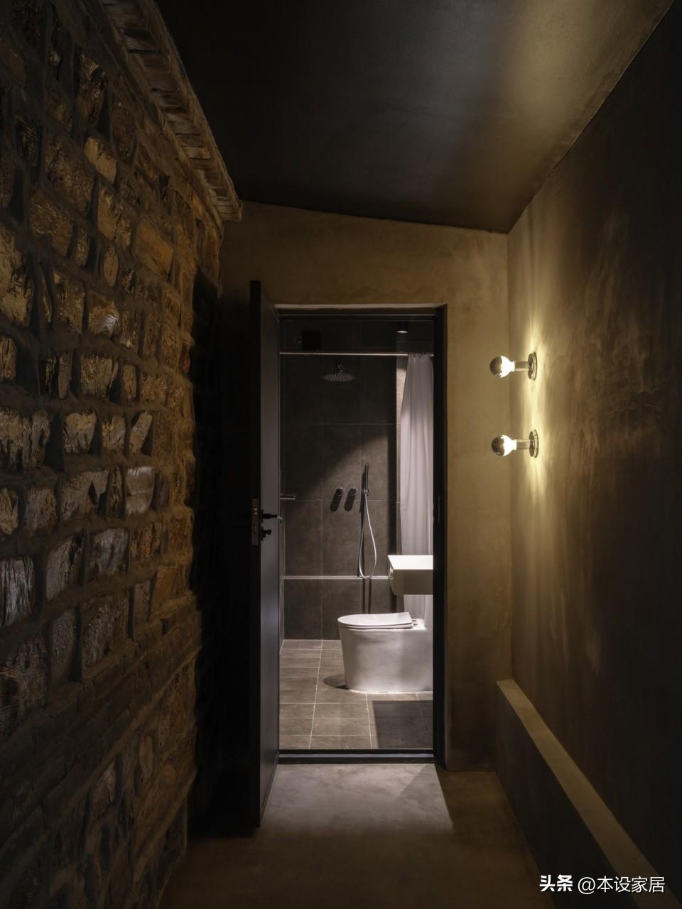 牆地面鋪設豐富肌理的灰色磚,搭配白色潔具,在材質碰撞間,流露出原始質感與當代設計的平衡之美。