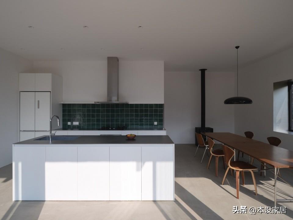 由於是新建的房子,融入更多現代元素,白色的櫥櫃和實木餐桌椅進行搭配,並以墨綠色瓷磚背板做點綴,簡約中透出沉靜質感,而大面玻璃推拉門,引入庭院景觀與自然光線,讓整個空間更加通透。
