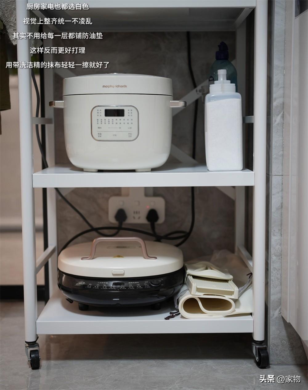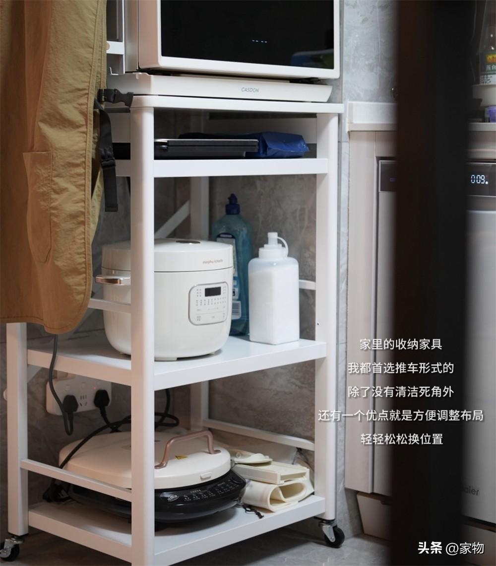 喫放收納架裝上萬向輪更加便於挪動,清潔地面角落縫隙的油污塵垢會方便不少,且架子上的廚電和雜物較多,裝上輪子也就不用每次打掃時候搬架子了。