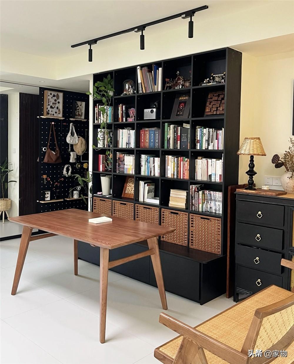 沙發對面的電視牆,現在改成了一組大書架,可以放下各種書本、雜物和擺件,既增加了裝飾效果,同時又能有“滿牆電視櫃”的收納功能,這樣一想,也算是挺實用的。