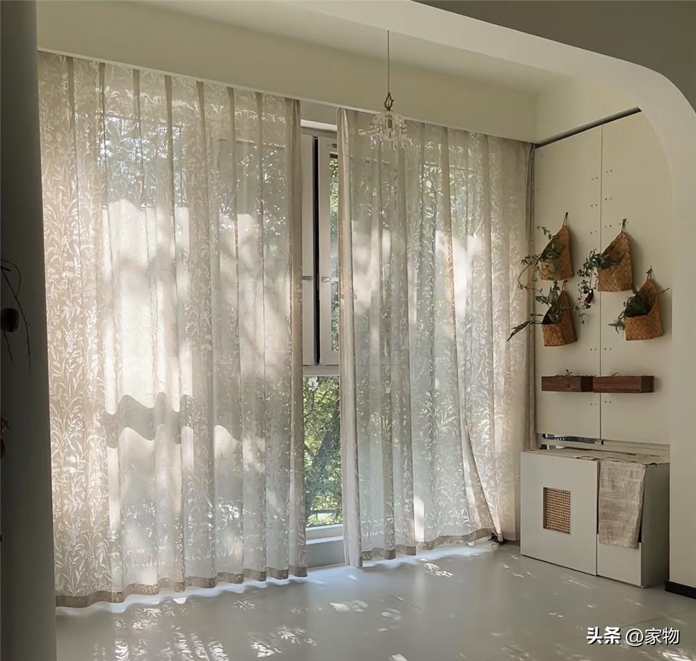 因爲樓層較低,窗外的陽光會透過樹蔭照進家中,再加上陽臺紗簾的花紋圖案,光影交錯間,讓家的視覺觀感顯得格外浪漫。