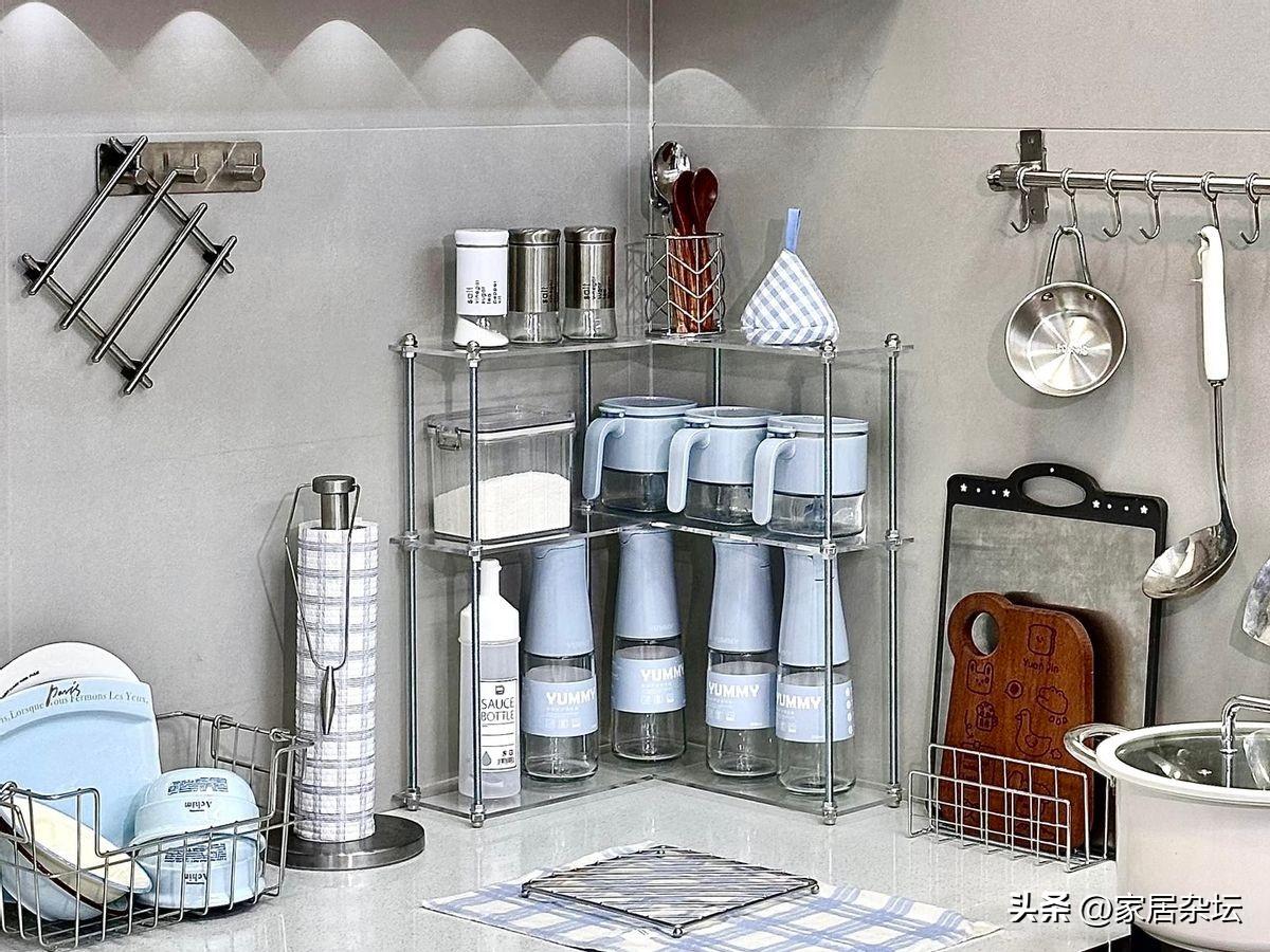 廚房檯面轉角調料架通常是三角形的,可以完美契合廚房的角落,採用雙層設計,下層放比較高的醬油醋,上層放矮的鹽、糖等。