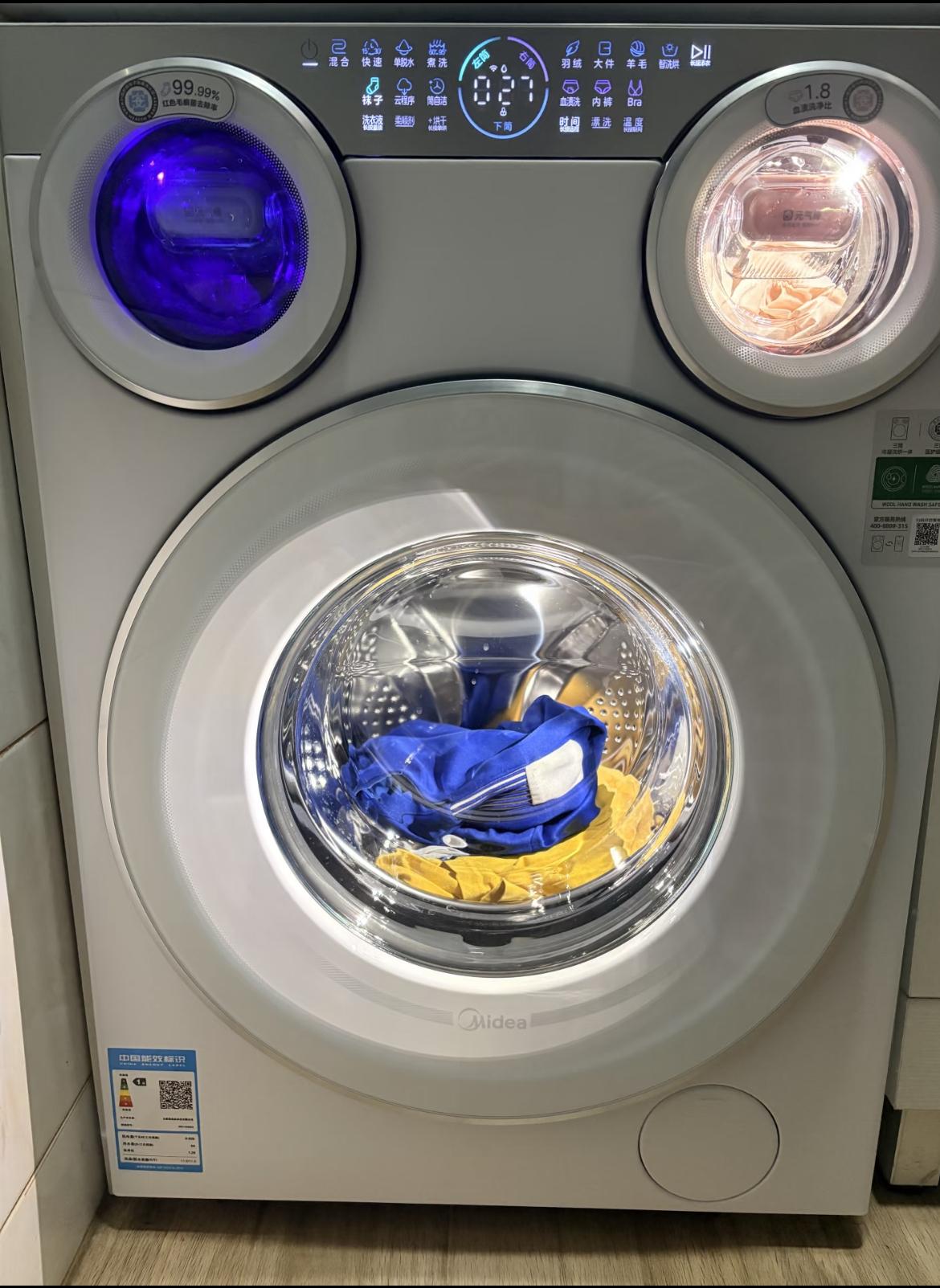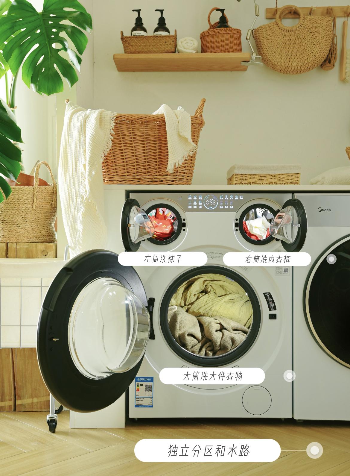美的可愛多的三筒分區設計,從根源上解決了這個問題。它採用“一大兩小”獨立內筒佈局,10kg大筒專門清洗外套、牀單等大件衣物,兩個0.5kg小筒則精準對應內褲、襪子等貼身單品,水路、風道、投放盒全部分開,從源頭杜絕水流與空氣的交叉污染。
