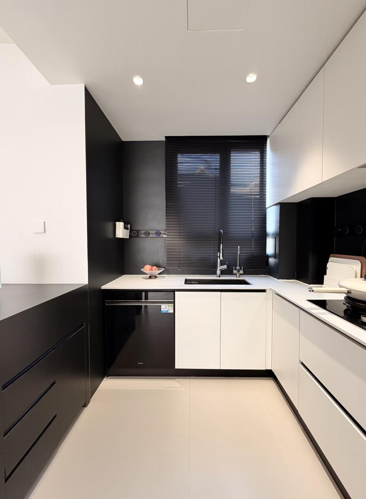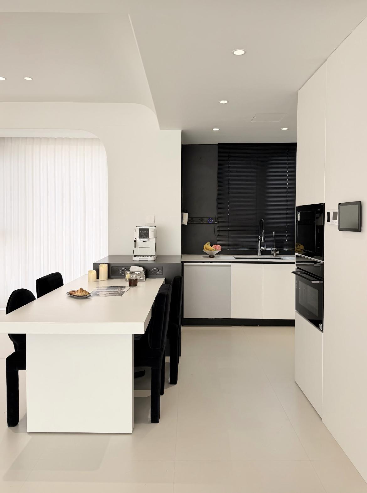 以大面積白色櫃體+地面爲基底,搭配黑色牆面/檯面/百葉簾,形成強烈的視覺對比,乾淨利落又不失層次。