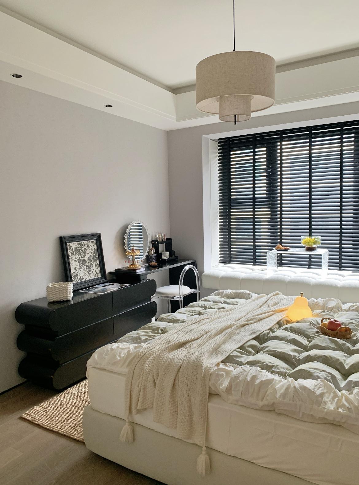 基底色調:以奶白+淺灰爲空間主色,搭配黑色木百葉、黑色傢俱作爲視覺錨點,乾淨柔和又不失高級感,避免了全白空間的單調。