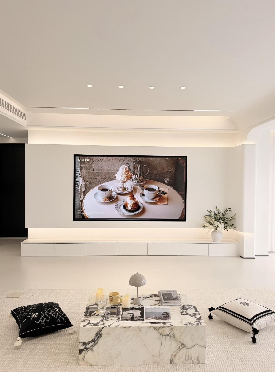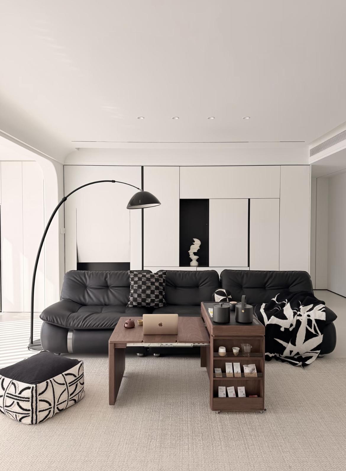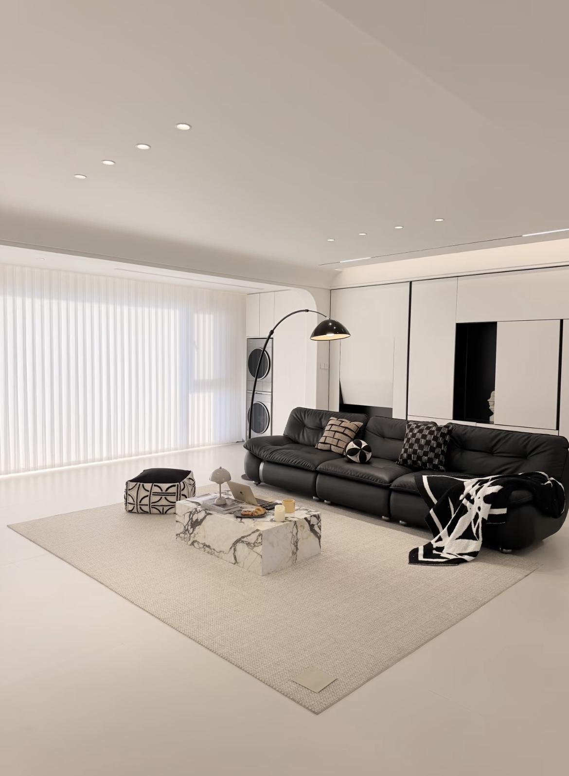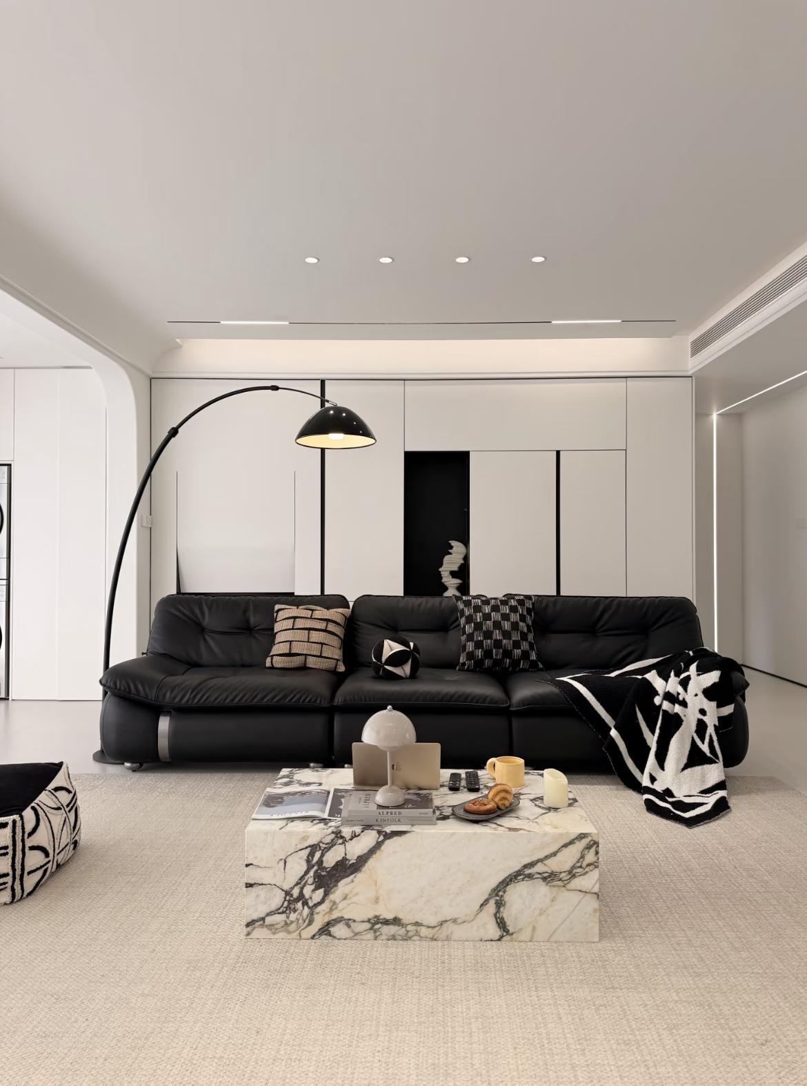 色彩點睛:黑色真皮沙發、黑色細框落地燈、大理石茶几的黑紋,作爲“重色”壓得住陣腳,同時與白色櫃體形成撞色,極大提升了空間的時尚感與質感。
