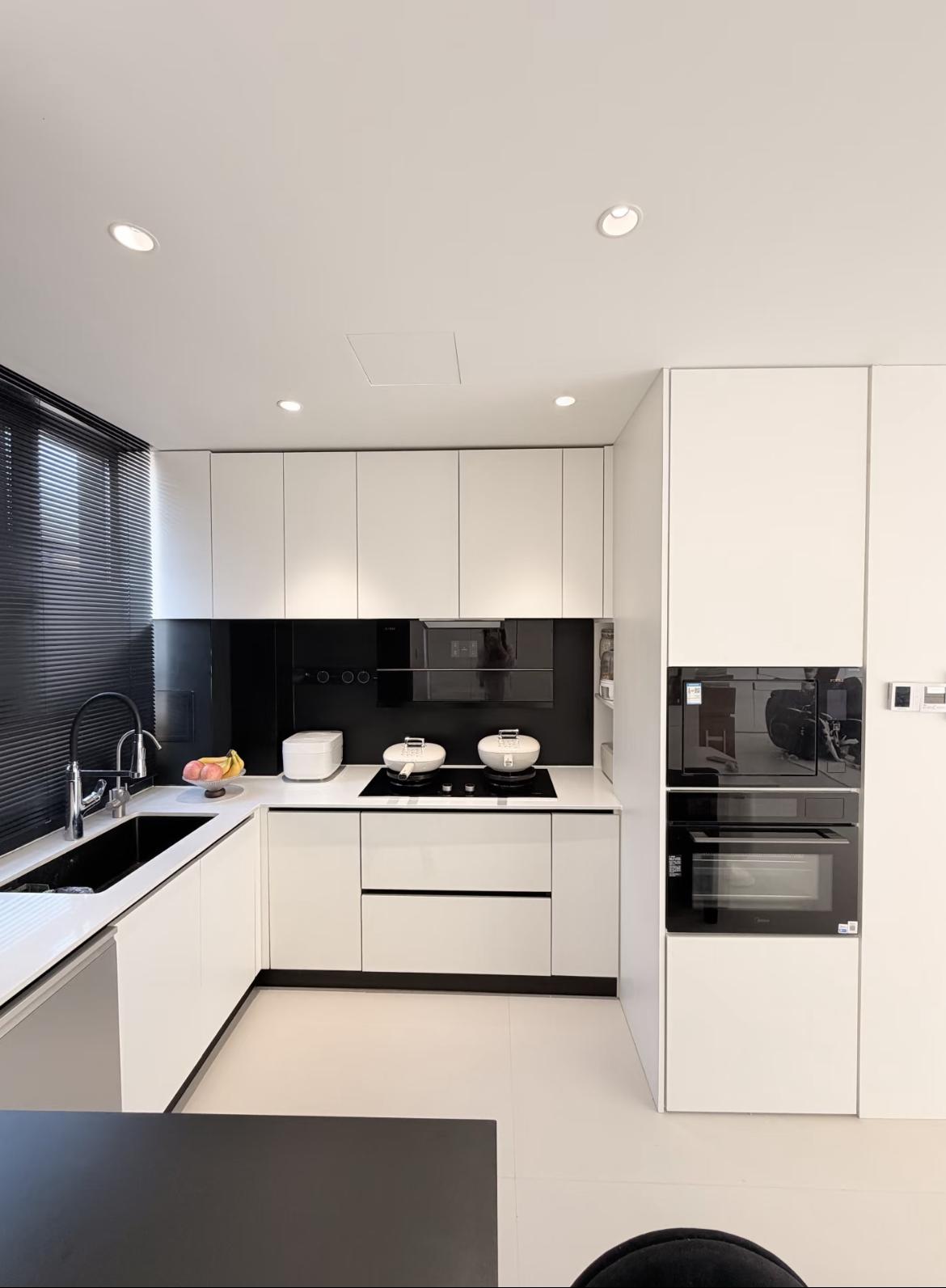 廚房操作區:L型佈局+抽屜式地櫃,符合“洗-切-炒”的黃金動線,抽屜設計比櫃門更適合拿取鍋具和雜物。