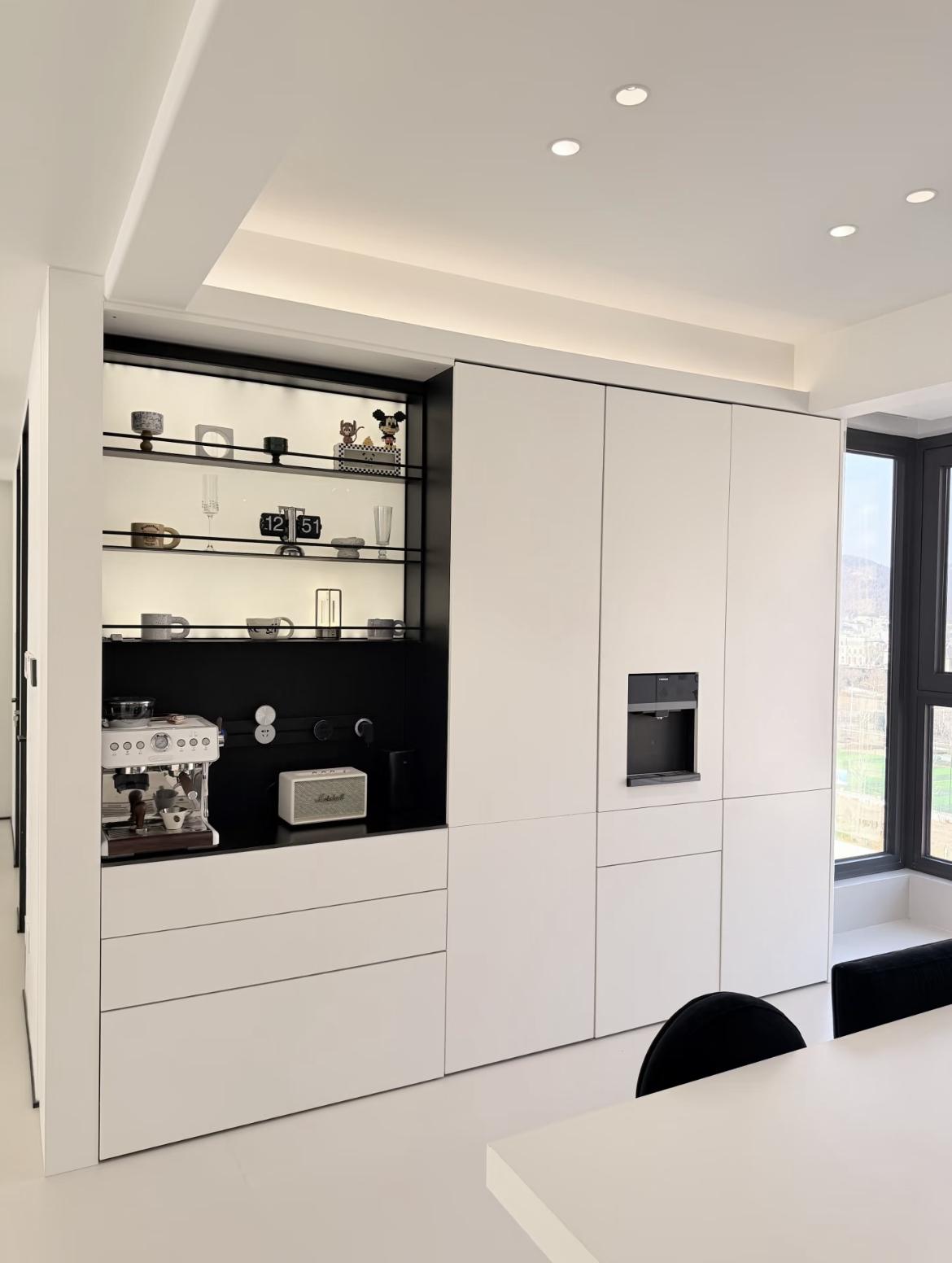 高櫃系統:嵌入蒸烤箱、飲水機、咖啡機等家電,實現“藏八露二”,既解放了檯面,又保持了視覺統一。