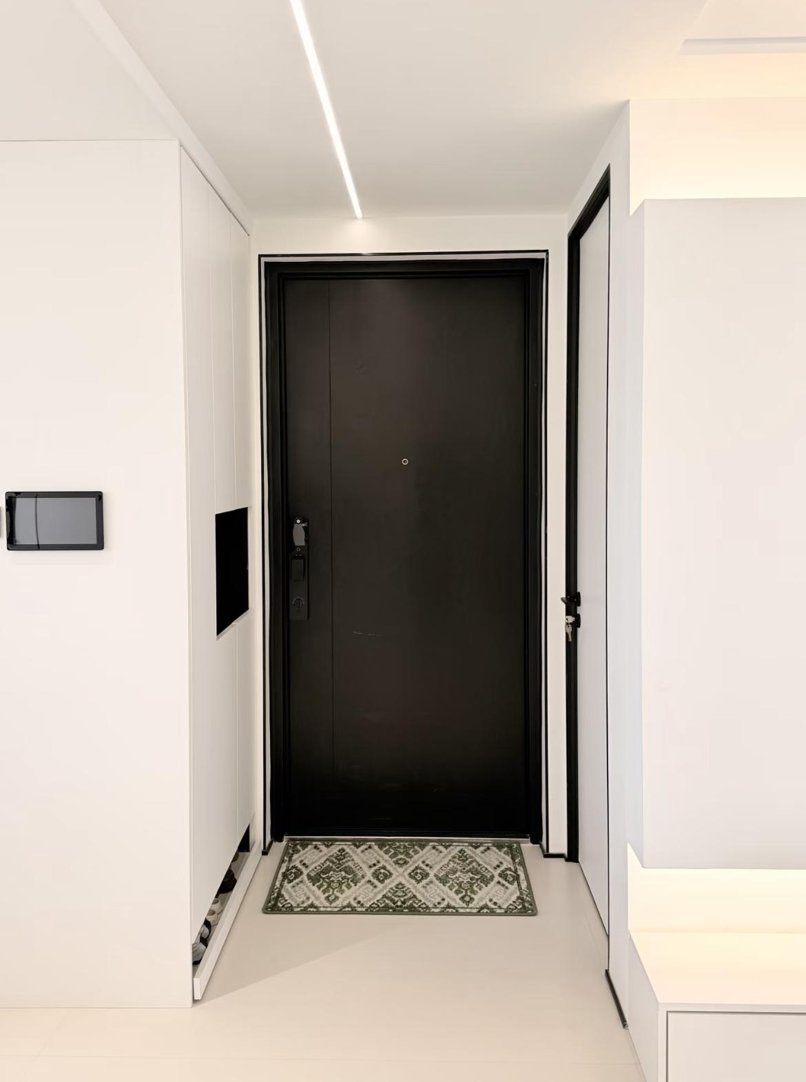 在玄關區的佈局上,主要側重於收納功能和空間的儀式感上。玄關鞋櫃採用無拉手通頂櫃門+黑白撞色,視覺乾淨利落,既顯空間高挑,又符合極簡風的審美,弱化了櫃體的厚重感,讓玄關更顯通透。