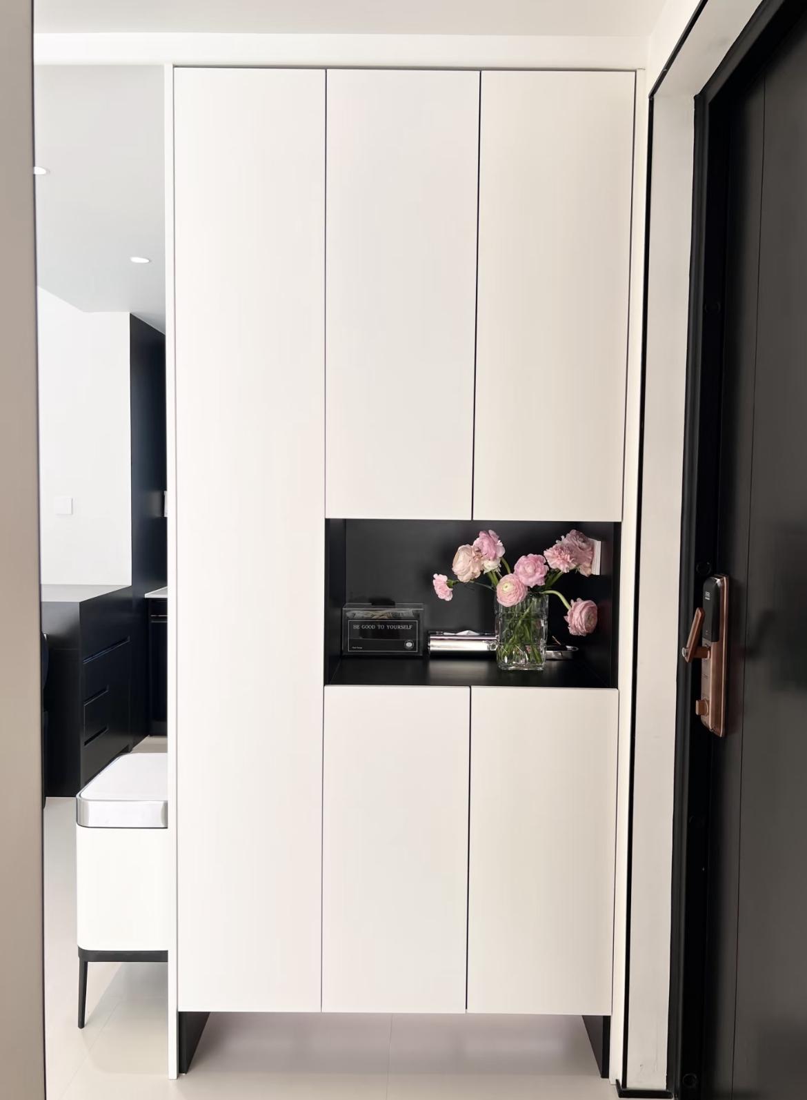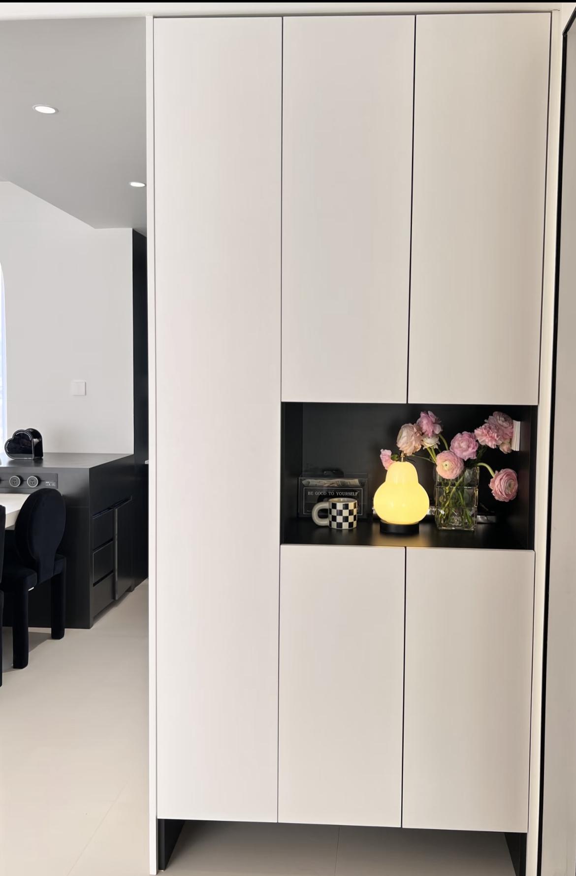 中部開放格:預留了展示與隨手置物區,擺放花藝、香薰、鑰匙盒等,既提升顏值,又方便進門時放置隨身物品。