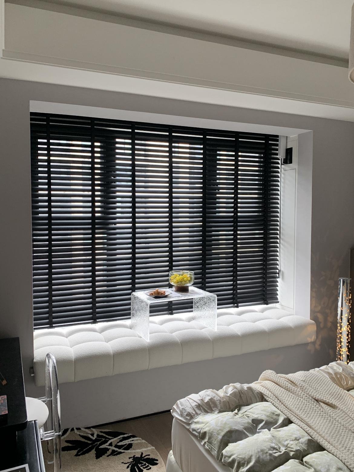 自然光利用:黑色木百葉簾可自由調節光線,白天柔化陽光,夜晚保證隱私,是提升氛圍感的關鍵細節。