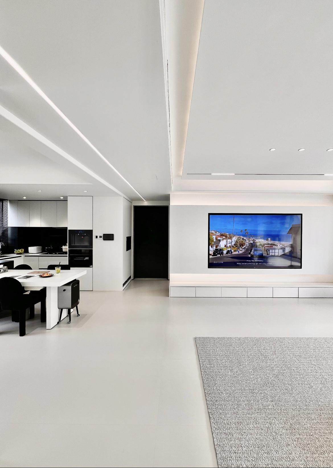 無主燈設計:頂面完全取消了傳統吊燈,採用磁吸軌道燈+嵌入式射燈+線性燈的組合。