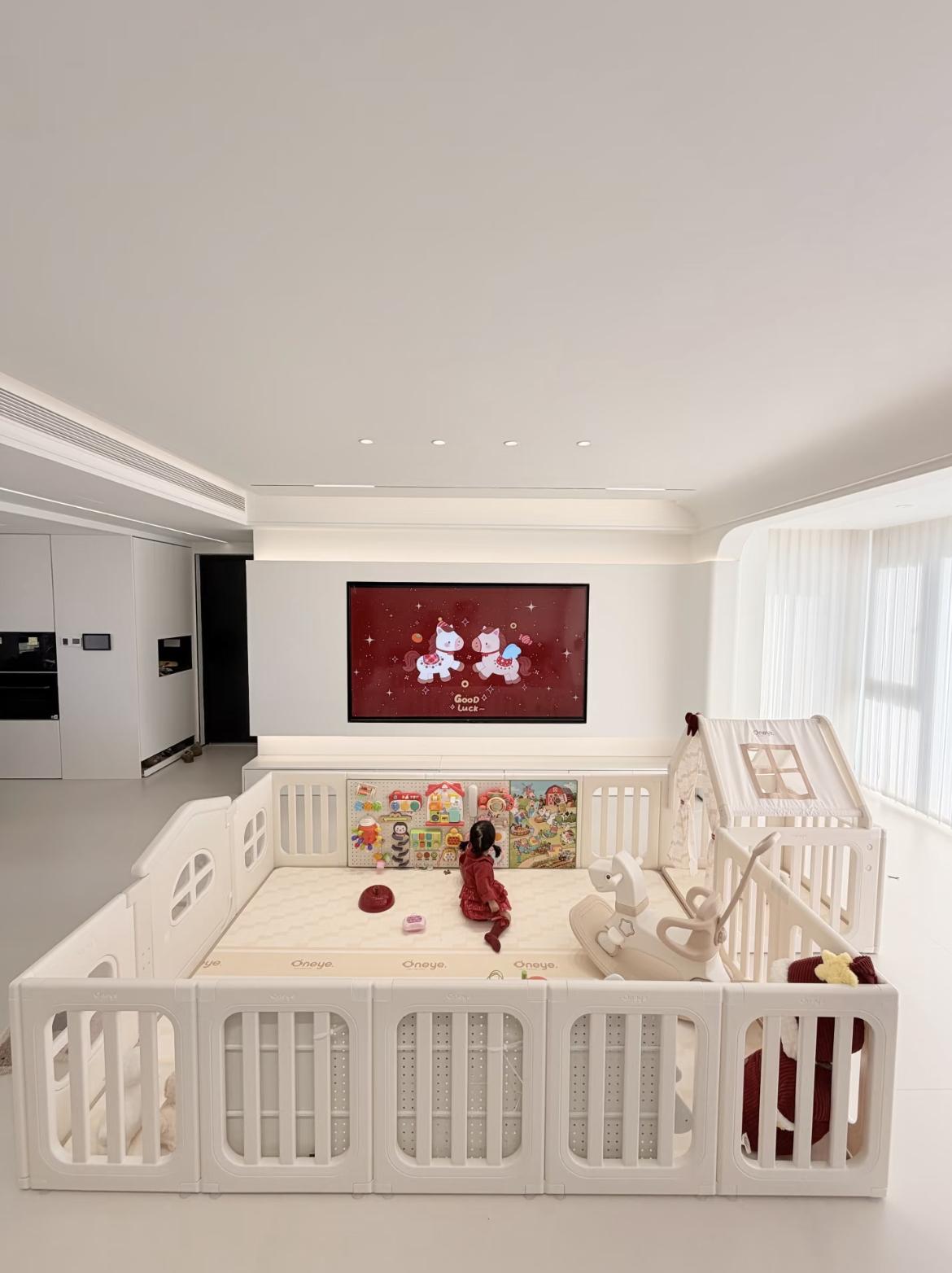 動線流暢:從圖片中可以看出,空間預留了充足的步行空間,形成了洄游動線(U型或環形走動),非常適合家裏有小朋友的家庭,大人走動時能時刻看護到孩子。