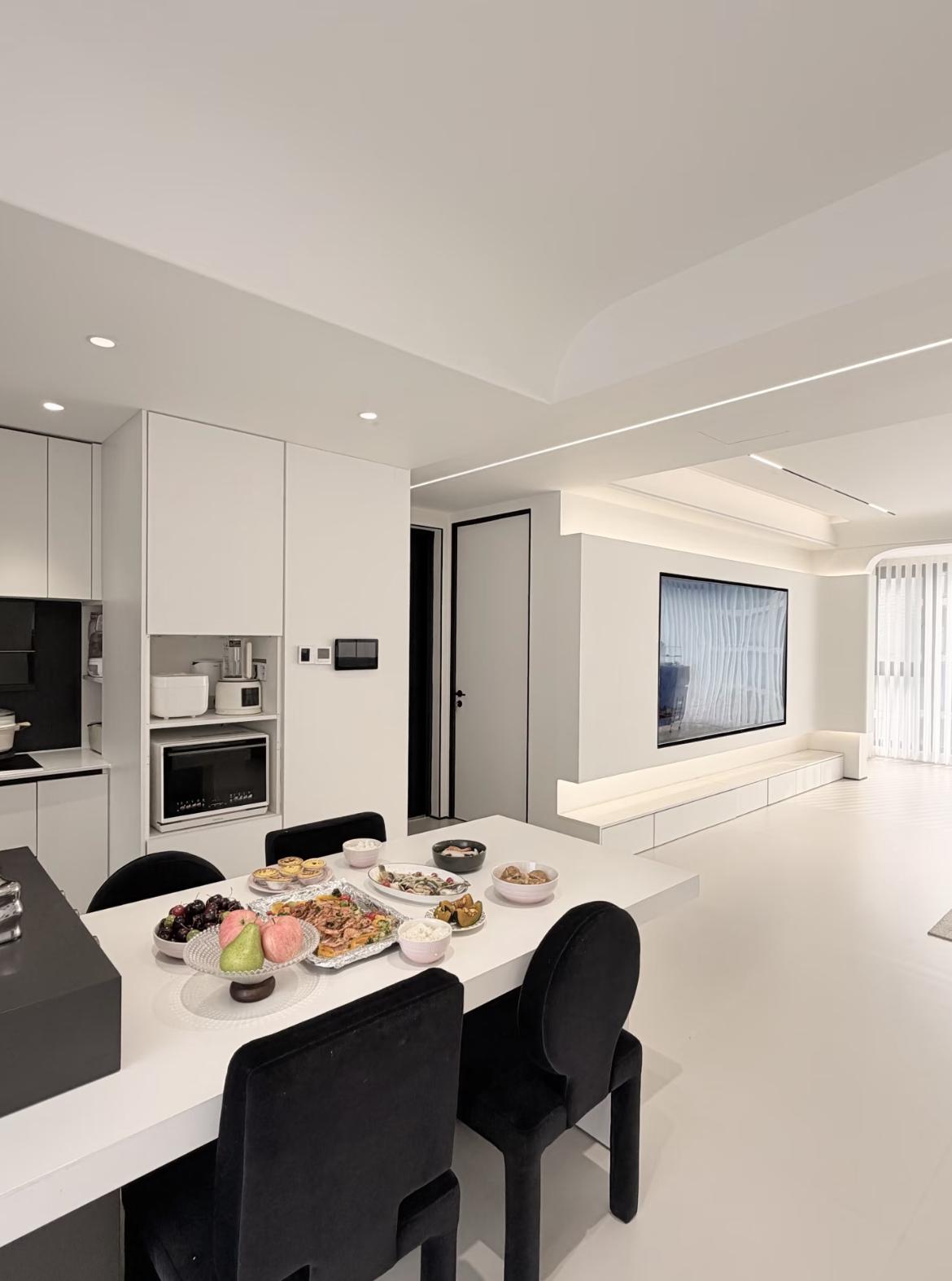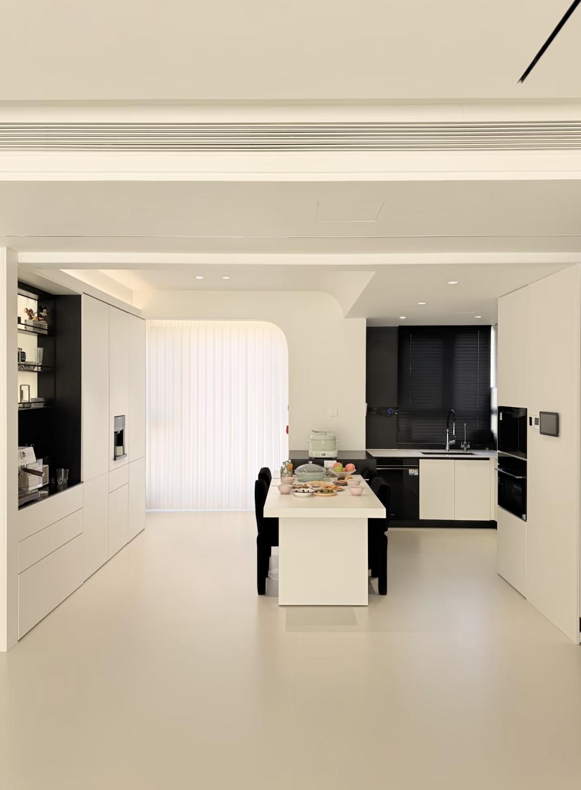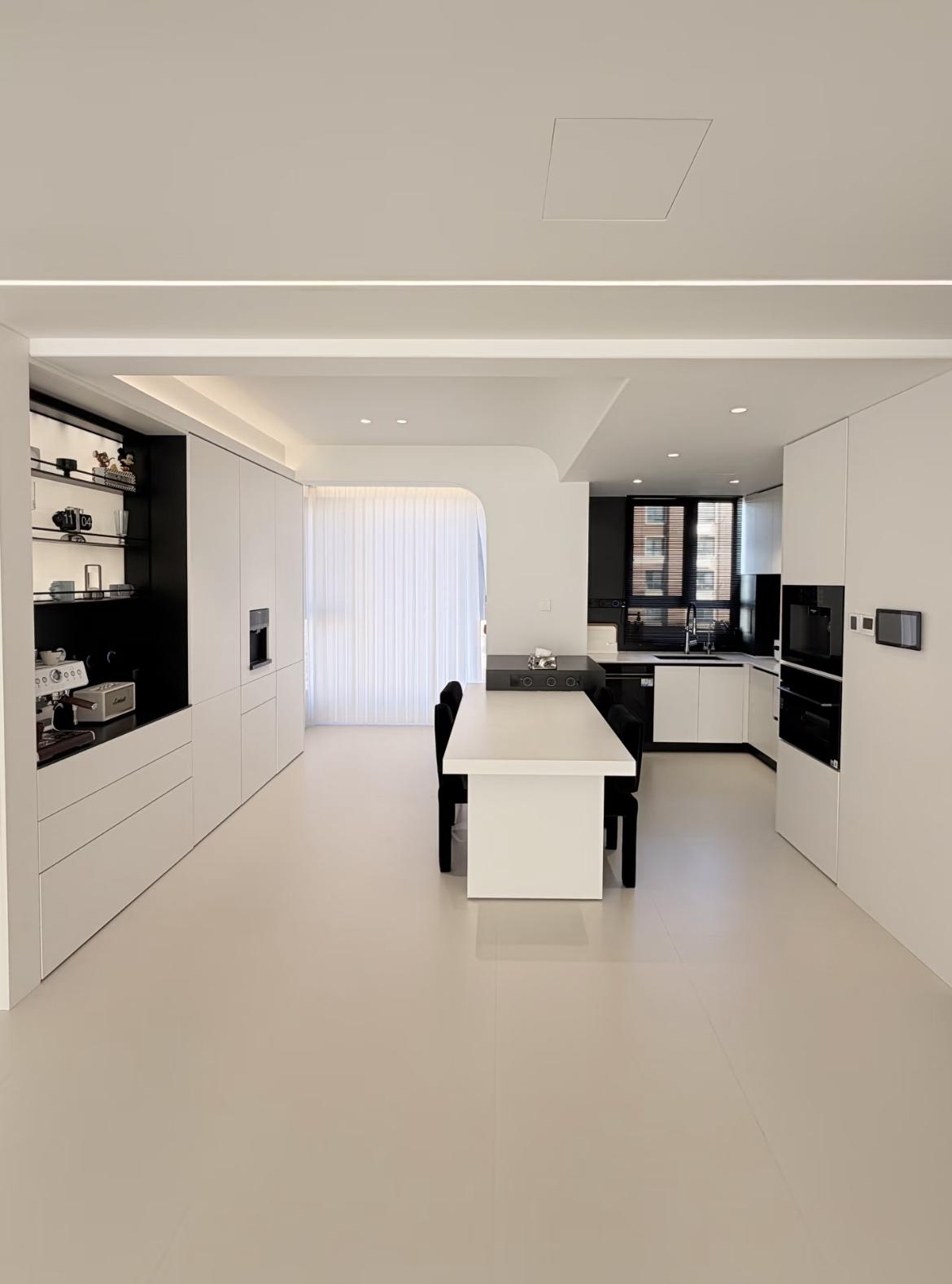 這是一套餐廚一體化的現代極簡設計,在空間利用、顏值與實用性上都做到了高度平衡,非常適合大平層或改善型戶型。