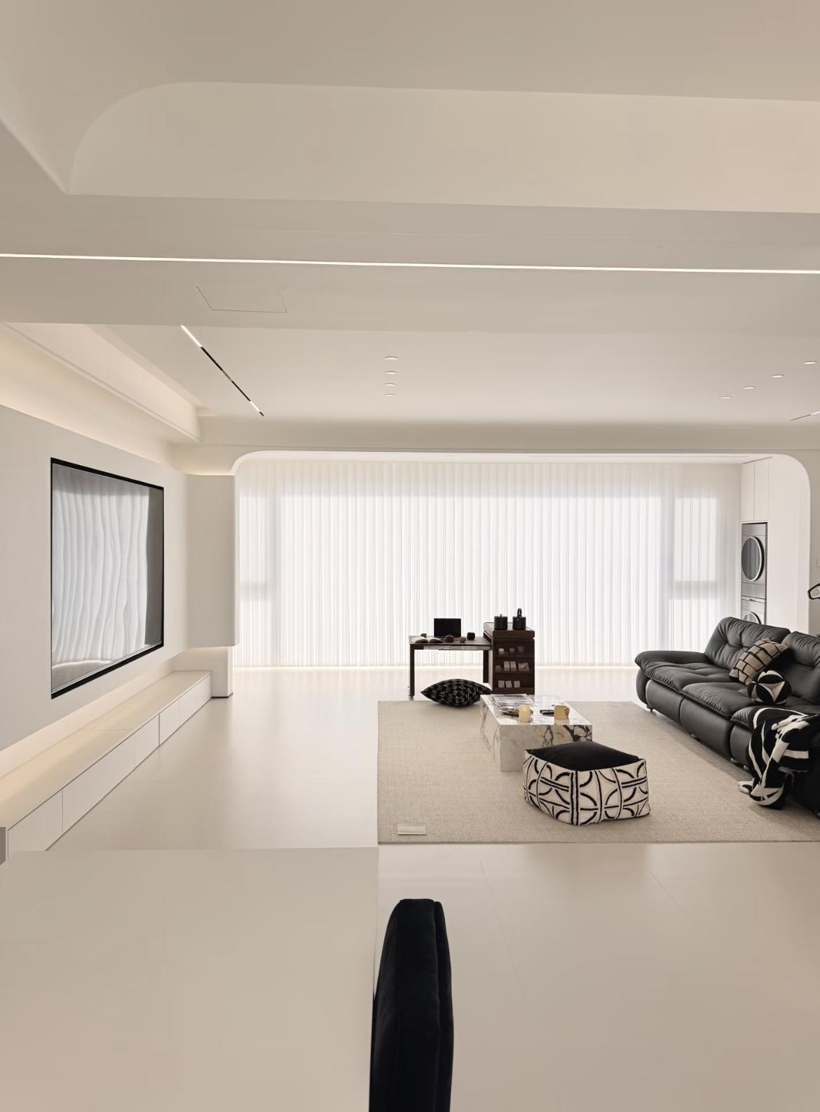 這是一套非常典型的極簡風(Minimalist)客廳案例,整體呈現出了極高的“留白”質感與空間延展性。