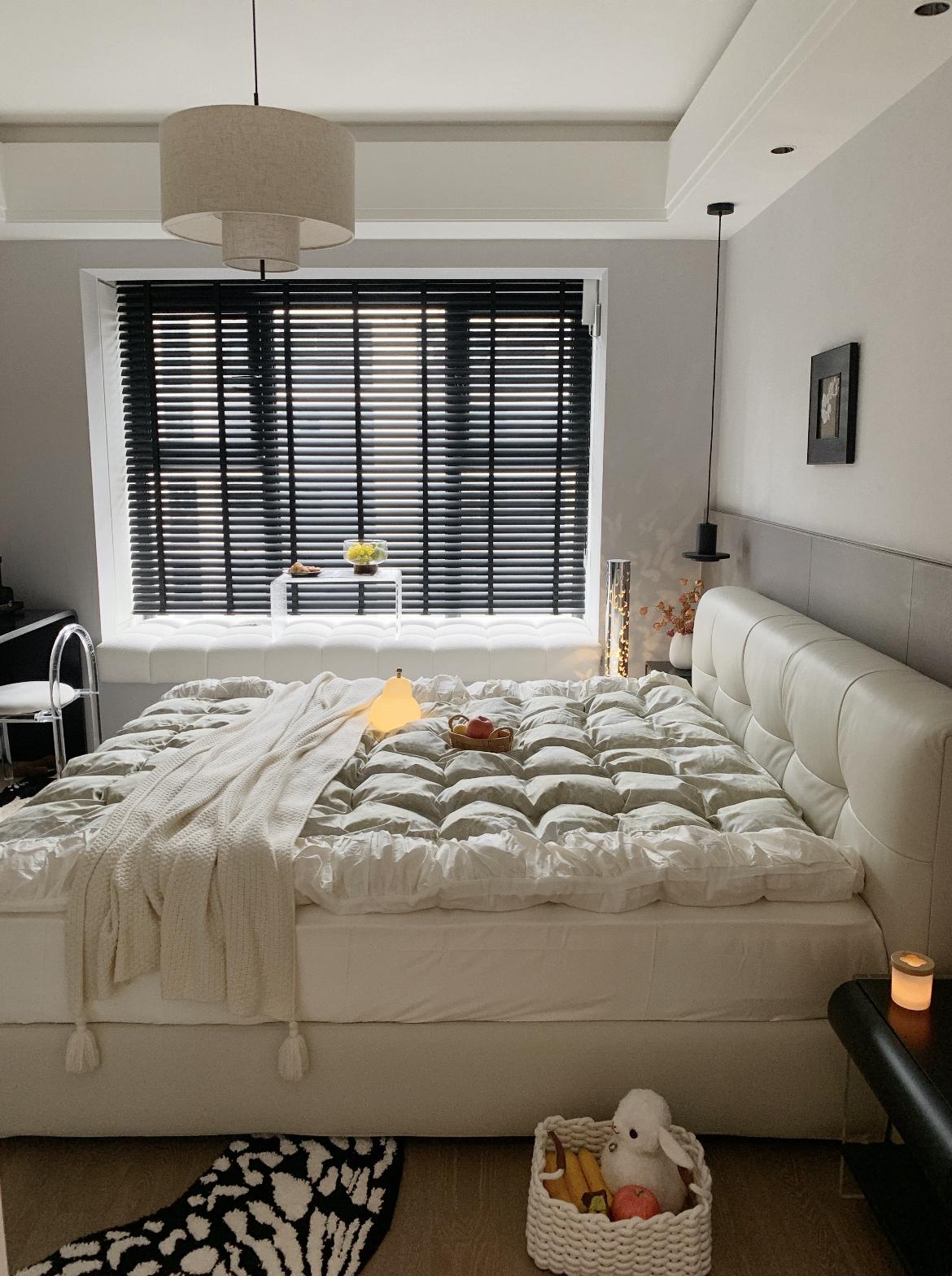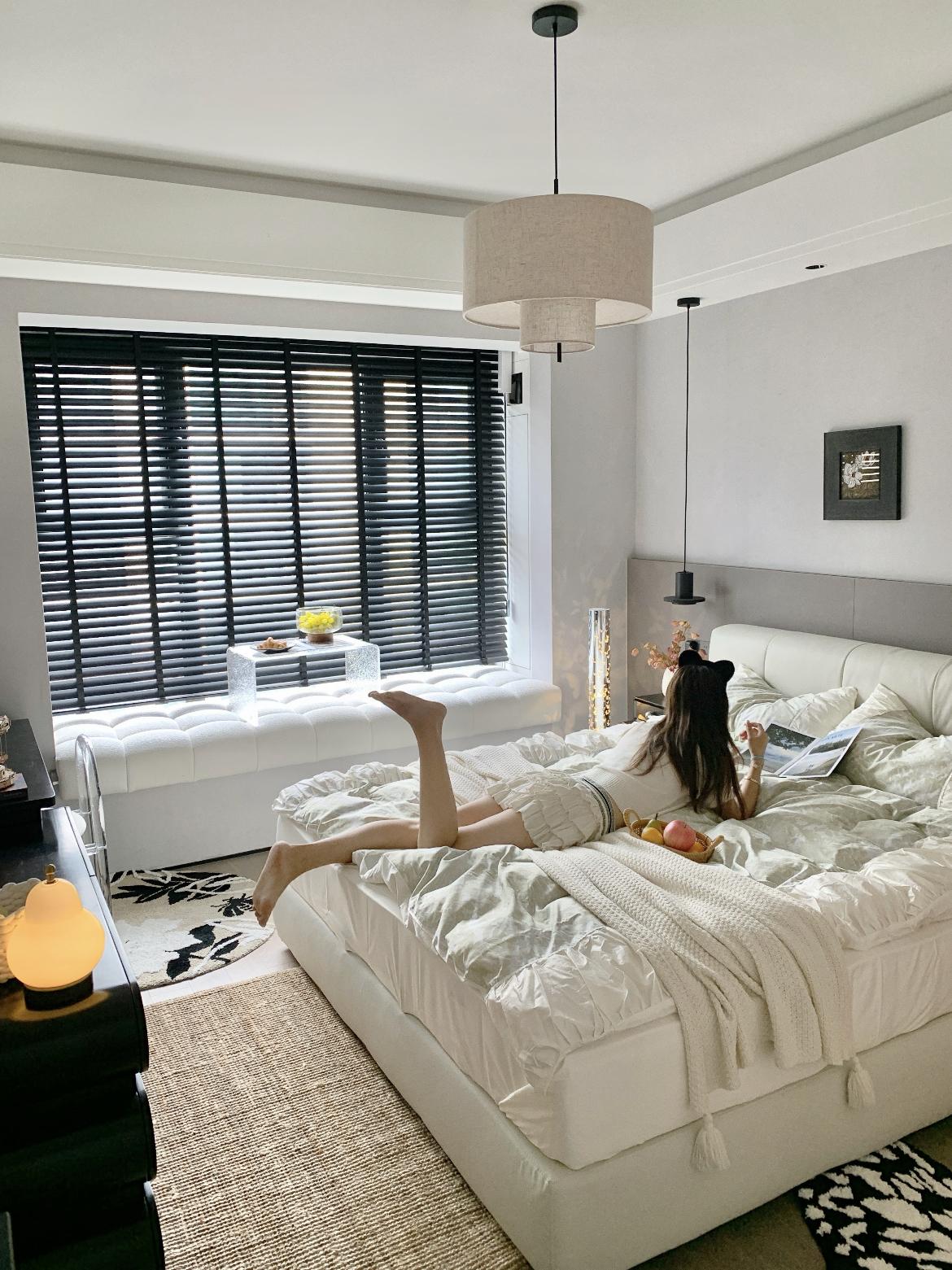 材質層次:皮質軟包牀、針織蓋毯、劍麻地毯、木質地板,多種天然材質疊加,讓空間觸感溫潤,弱化了極簡風的冷硬感。