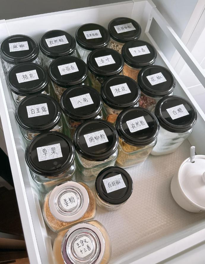 不得不說,網友真的是走心了,不僅給老乾媽瓶子換了蓋子,還給每一種調料用美紋紙貼上了標籤,這真的是大智慧啊~整齊劃一,被驚豔到了!