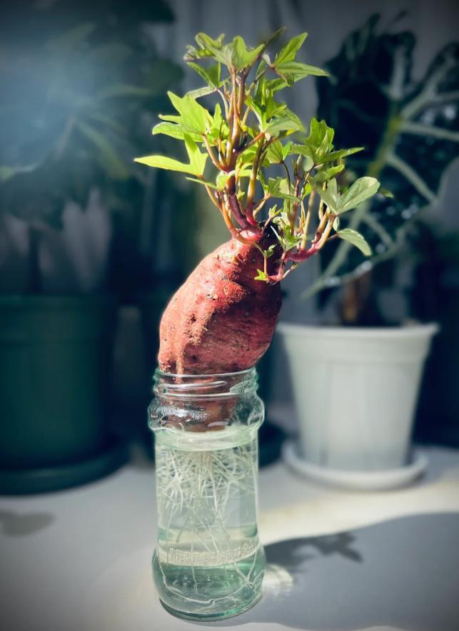 看看網友用老乾媽瓶子,直接水培了紅薯。