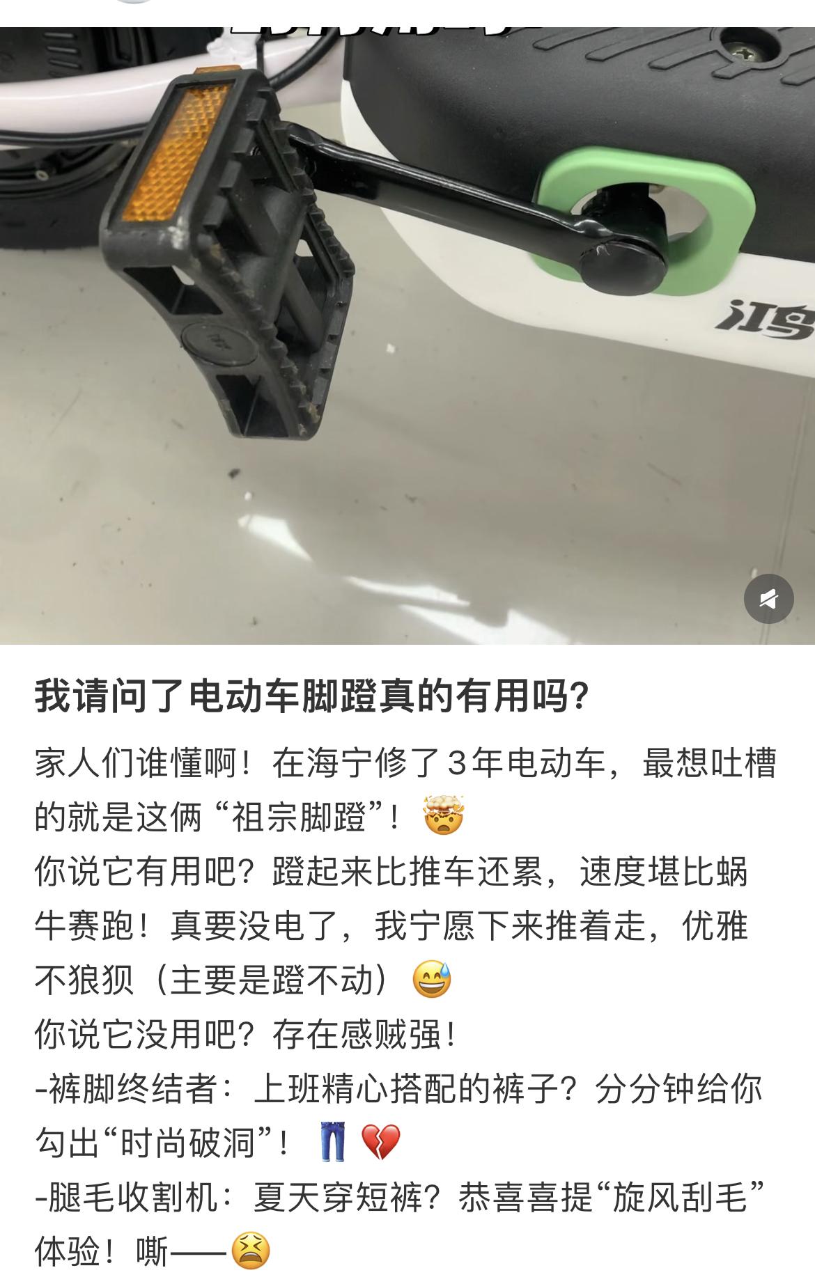 而且腳踏板位置還特別高,腳踩在上面全程懸空,沒法自然放平,完全不符合人體工學,本來腳踏板是爲了讓騎行更舒服,結果設計得還不如沒有,純粹是爲了湊合規造型,實用性差到極致。