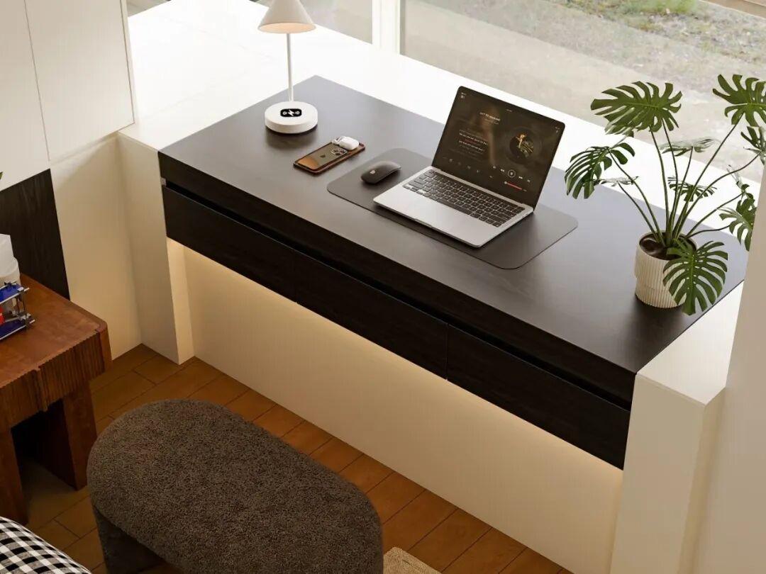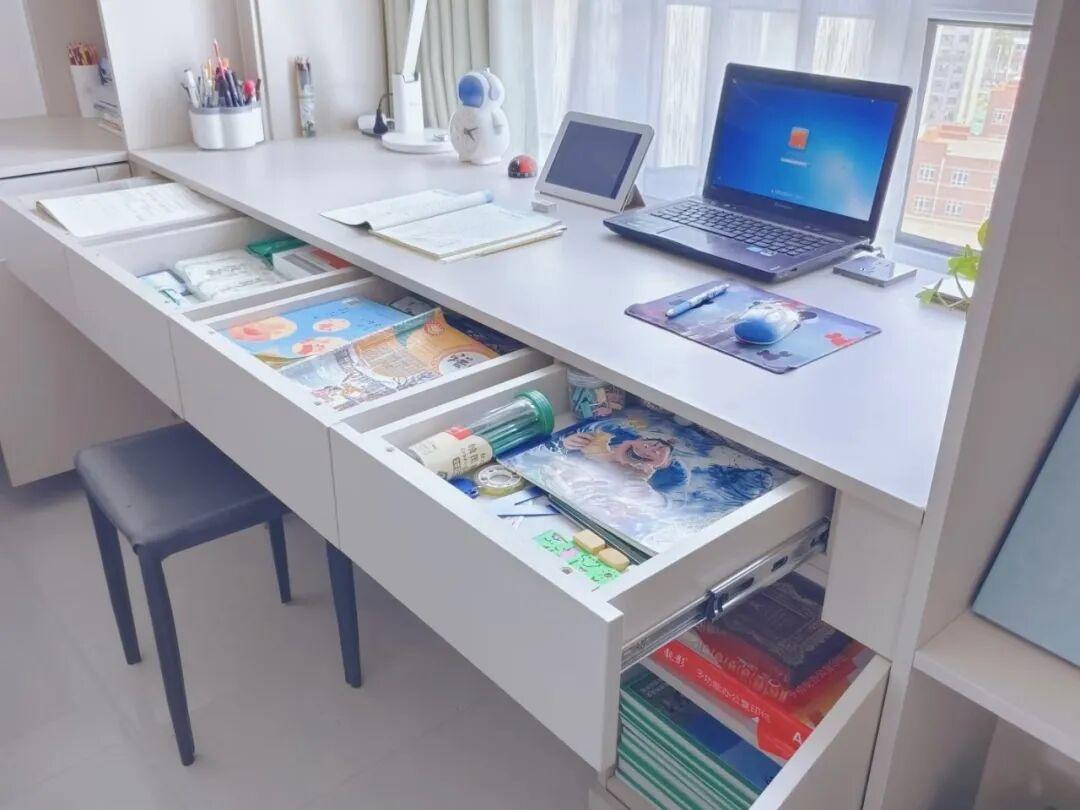桌面桌面材質,建議選擇實木或者是高密度板材,耐磨耐髒耐用。另外在設計時要預留好插座位置,方便使用電腦、檯燈。