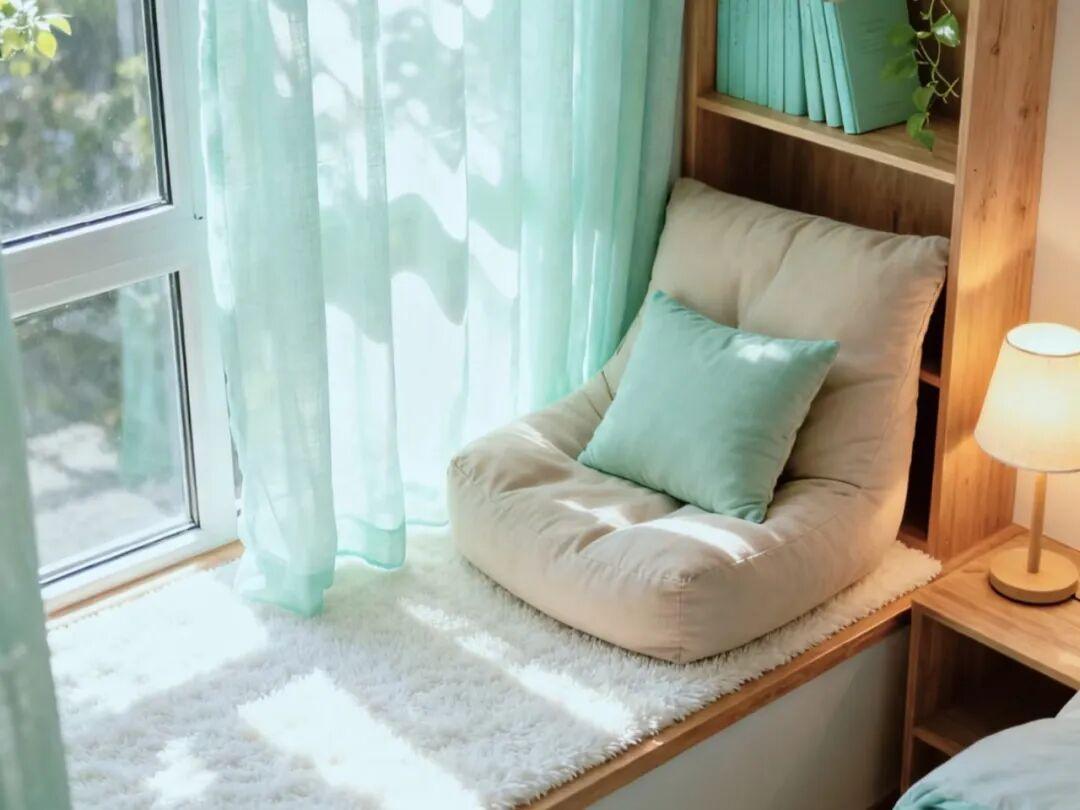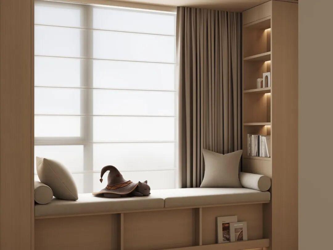 軟墊的材質,面料建議選擇防水防污的科技布或者是棉麻材質,方便打理。飄窗如果在臥室,還可以搭配同色系的窗簾和牀品,整體感更強。