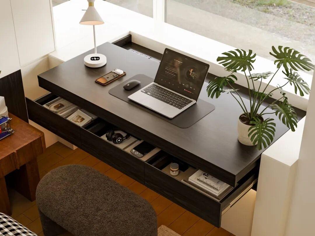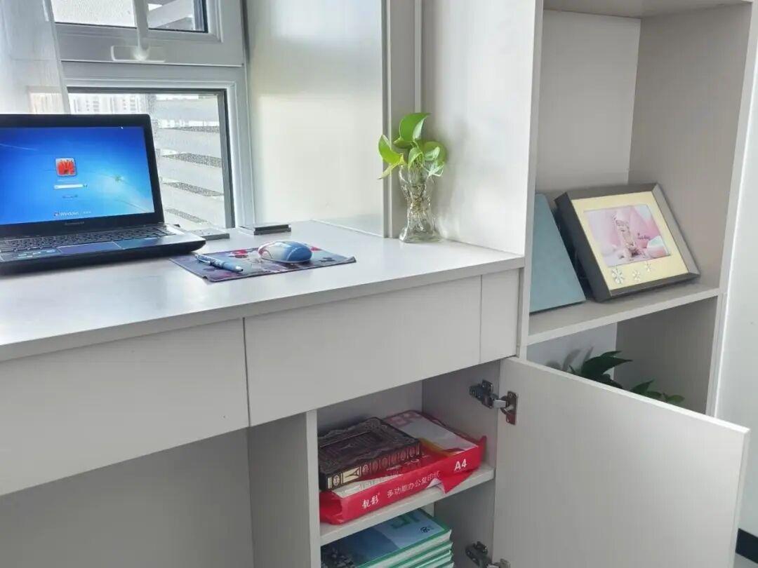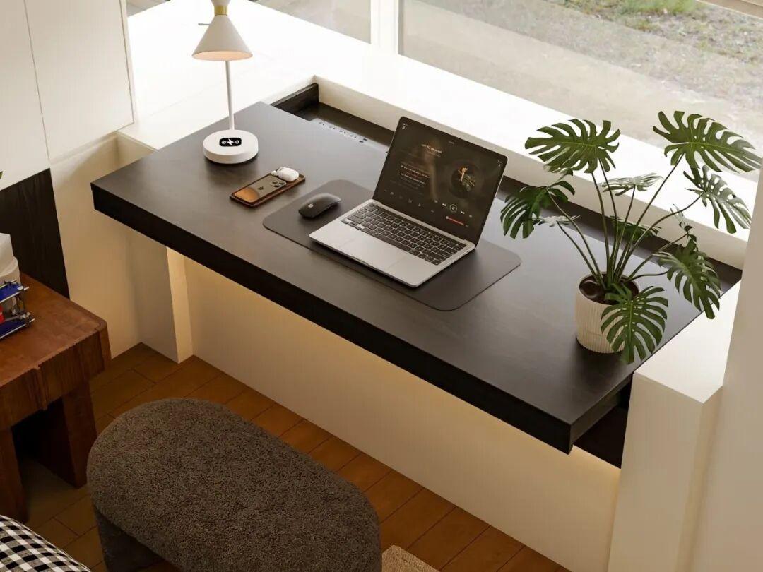 飄窗改爲抽拉式書桌,對小戶型是很友好的。原本可能需要單獨一個放書桌的空間,現在把飄窗利用起來了。
