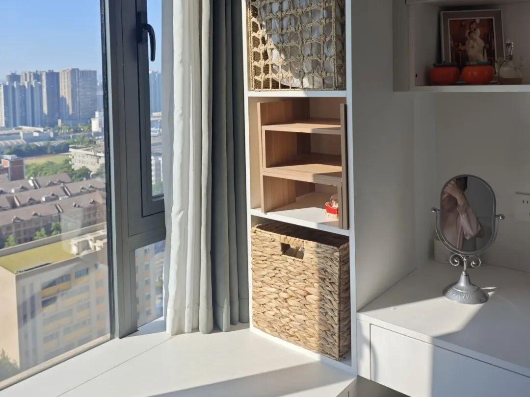 飄窗不用砸,也是簡單的改造一下,把側邊打成收納櫃,榨乾每一寸空間,把它都利用起來。