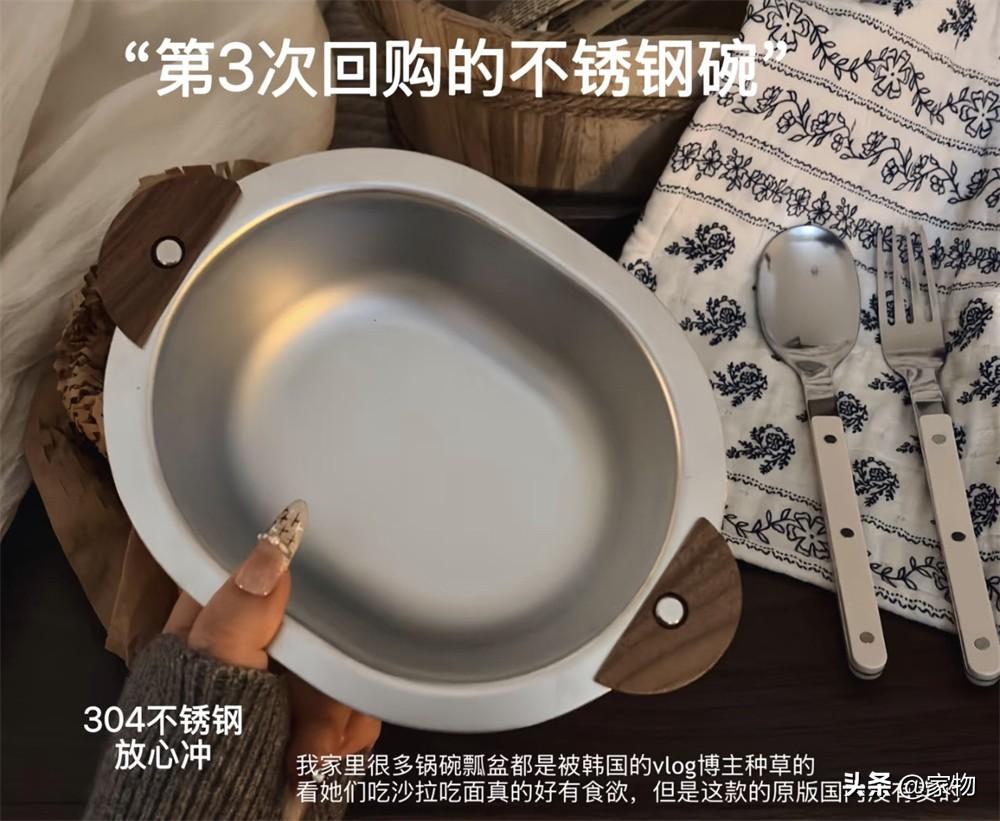 橢圓形狀的不鏽鋼碗,本身是磨砂的304不鏽鋼材質,兩側還帶兩個木質手柄,泡麪盛粉的時候方便端拿還不燙手。