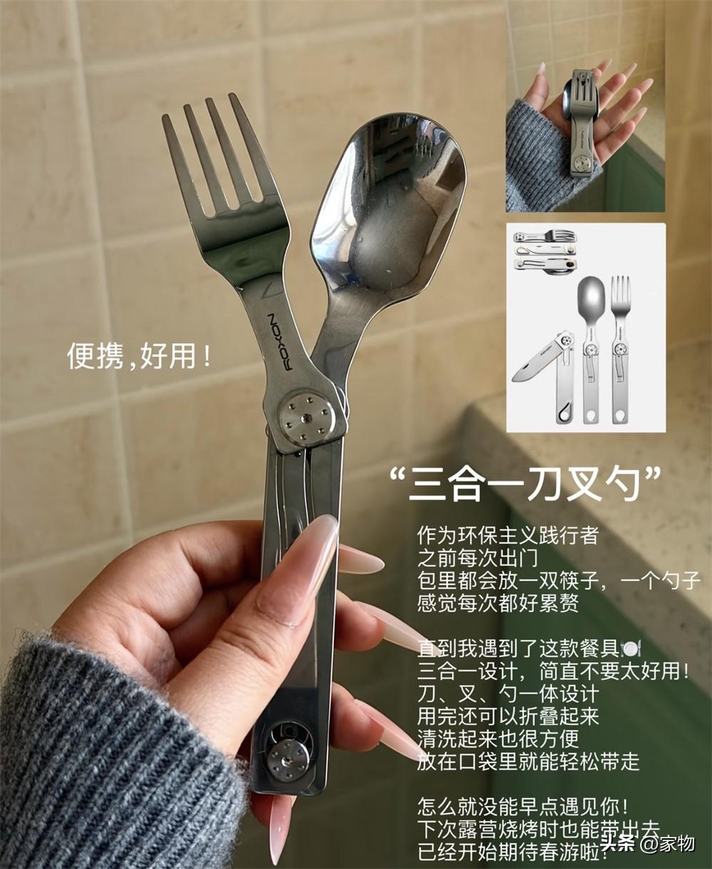 小刀、叉子、勺子三合一的便攜式餐具,實話實說,平時在家裏其實用不太上,但一碰到出差、旅遊、露營的時候,它可謂是我必帶的隨身用品,在外面用這種自己的餐具又幹淨又放心,更不用說小巧的勺身還更加便攜了。