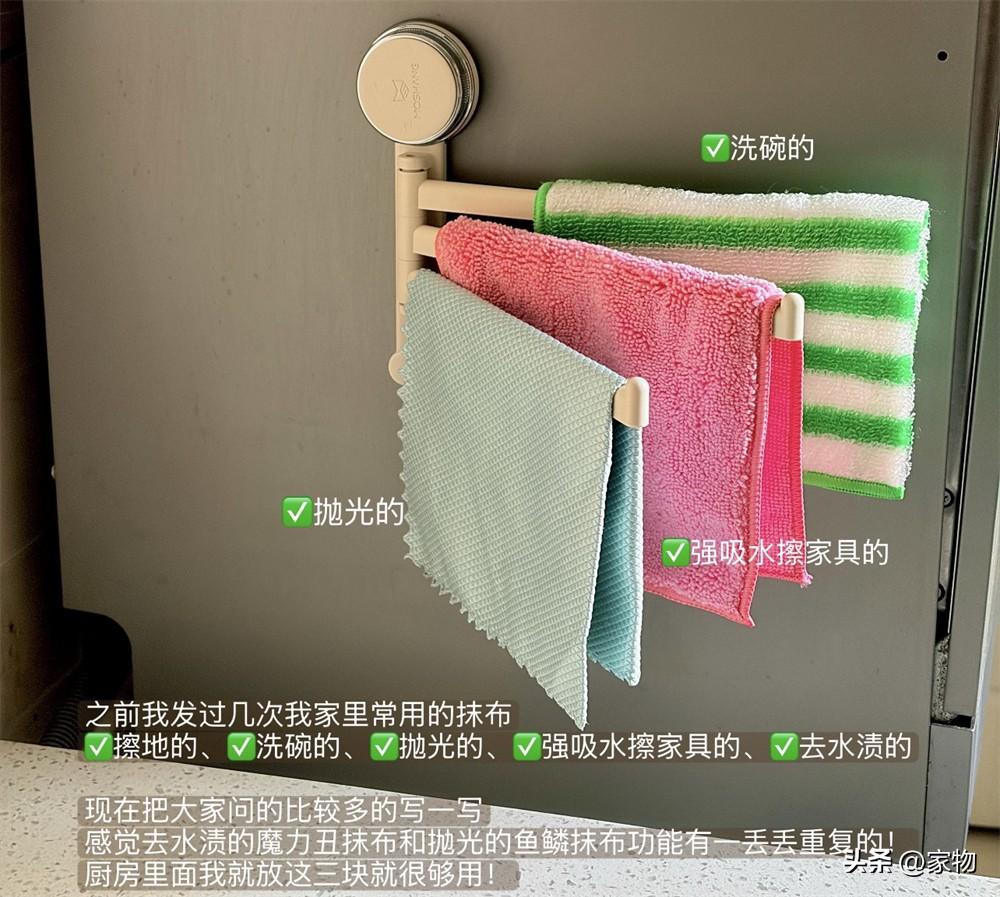 我家的抹布光是種類就有六七種,洗碗的、擦桌子的、拋光的……這些抹布,基本都被我用兩個抹布架分別收納在廚房和衛生間裏,這種磁吸式的抹布架適用於廚房、衛生間大多數的瓷磚冰箱和光滑的金屬表面,節省空間,用着也方便。