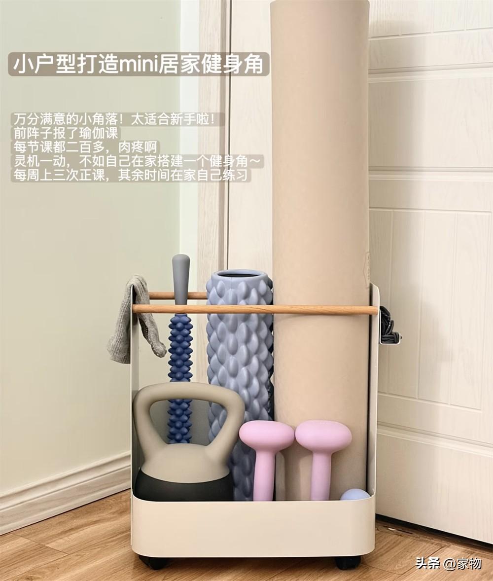 極爲適合小戶型的健身用品收納推車,可以將啞鈴、壺鈴、瑜伽墊、泡沫軸等各種物品歸類收納在一起,放在門後面或者家裏其他角落縫隙處,也不會太佔地,關鍵是看起來整潔,拿放歸類也更方便。