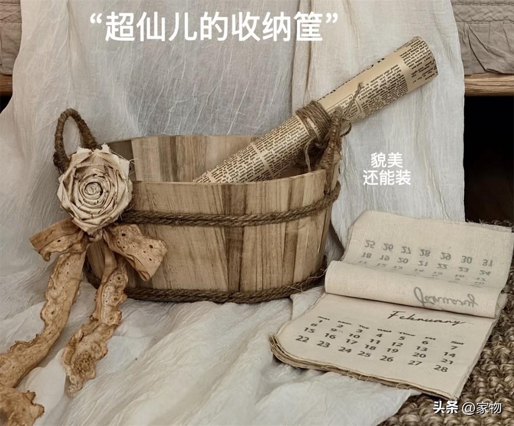 這收納筐是個純手工製品,個人感覺有點像是微縮的木質澡盆,但因爲旁邊的手柄和裝飾,又多了些許田園風的美感。